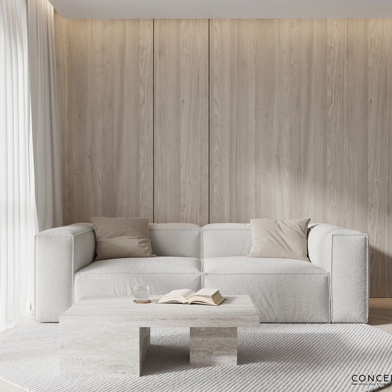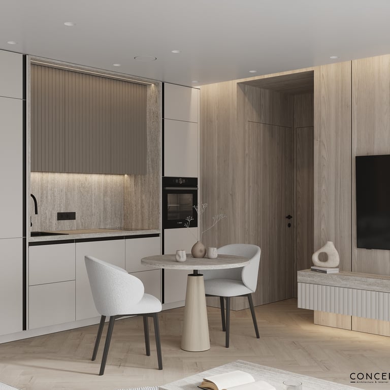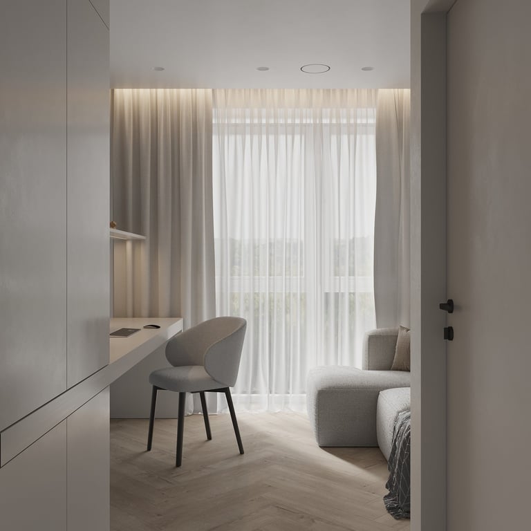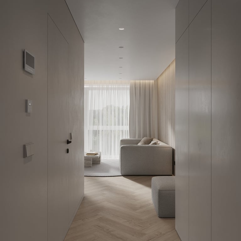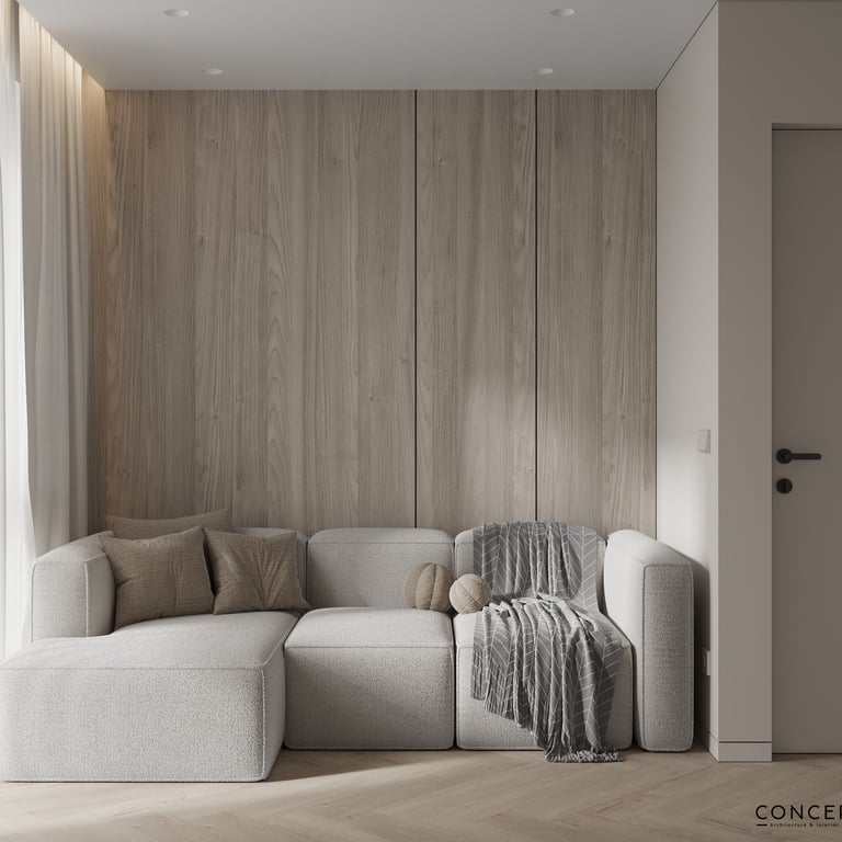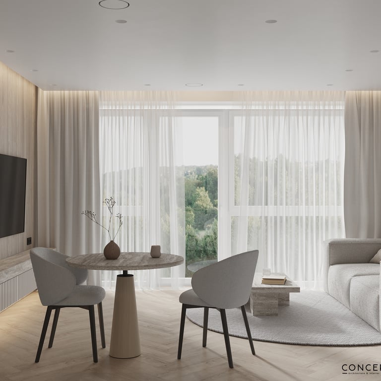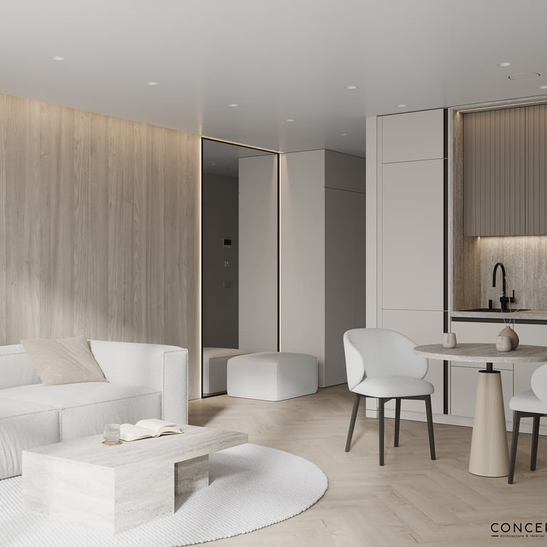 Monochrominis, minimalistinis, šviesių spalvų interjero projektas, kuriame duominuoja vertikalios linijos, suprojektuotos siekiant maksimaliai praplėsti buto erdvę. Interjere sienų dekorui naudojamos baldinės plokštės. Projekte vyrauja minimalistinės, juodos detalės ir minkšti, apvalių formų baldai, suteikiantys interjerui lengvumo ir švelnumo.