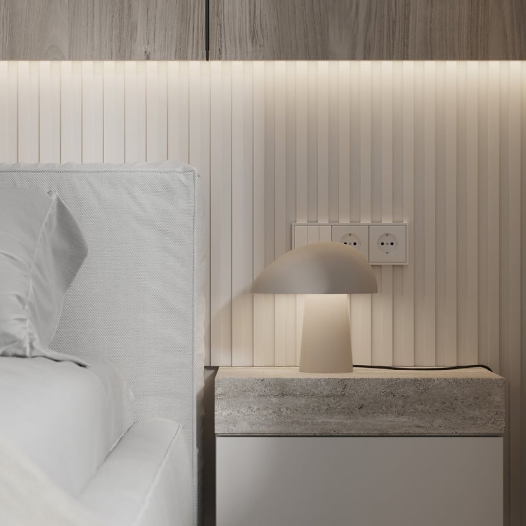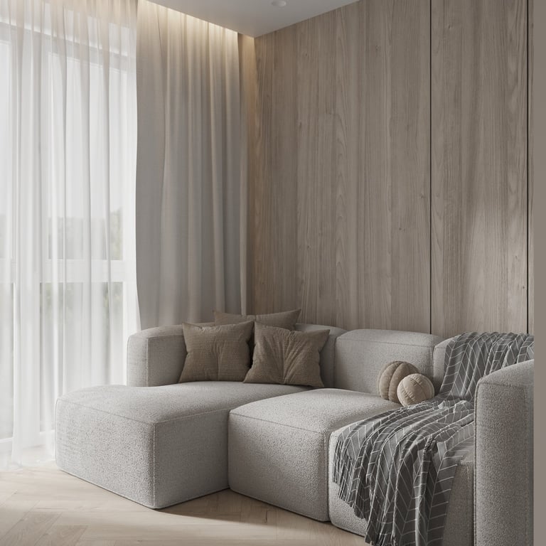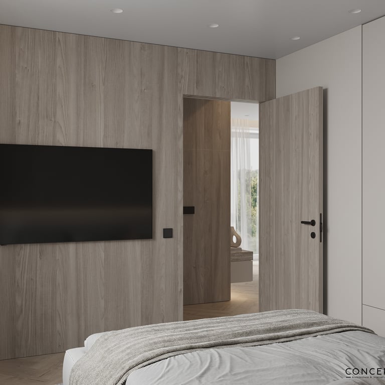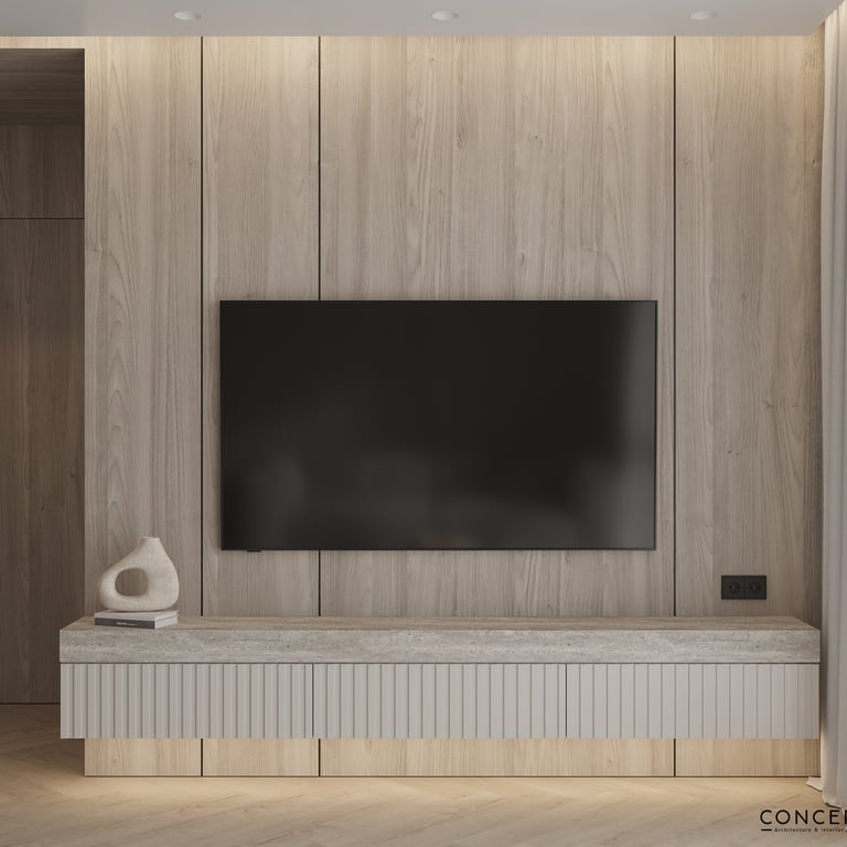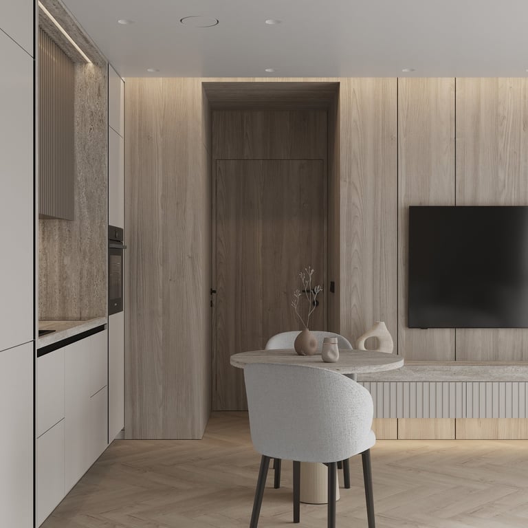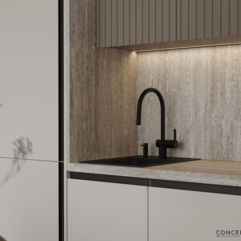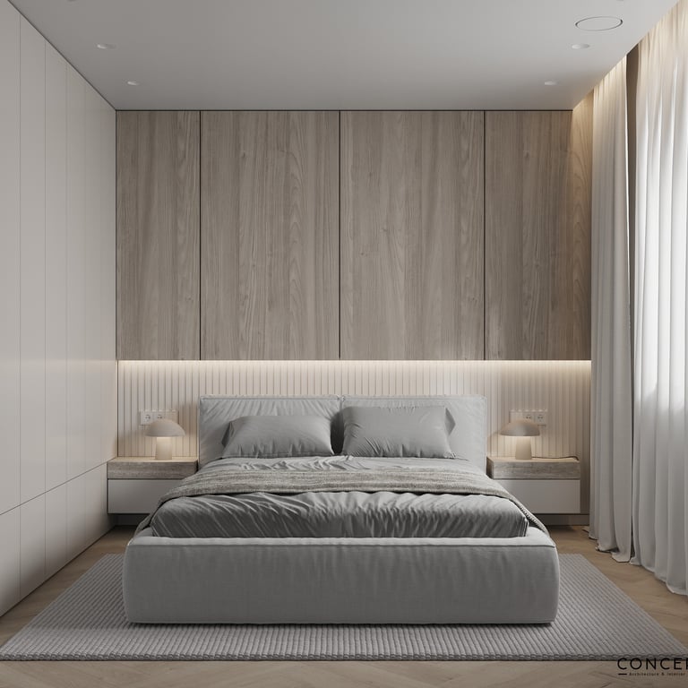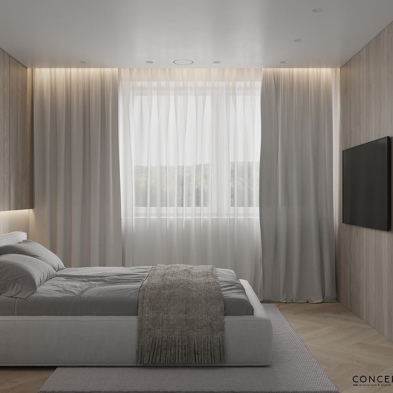 Monochrominis, minimalistinis, šviesių spalvų interjero projektas, kuriame duominuoja vertikalios linijos, suprojektuotos siekiant maksimaliai praplėsti buto erdvę. Interjere sienų dekorui naudojamos baldinės plokštės. Projekte vyrauja minimalistinės, juodos detalės ir minkšti, apvalių formų baldai, suteikiantys interjerui lengvumo ir švelnumo.