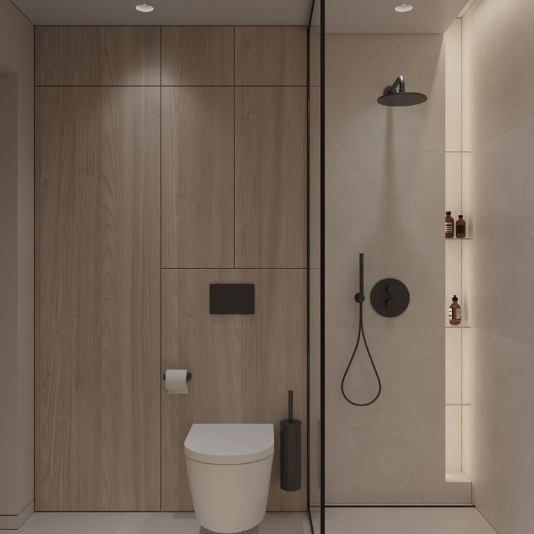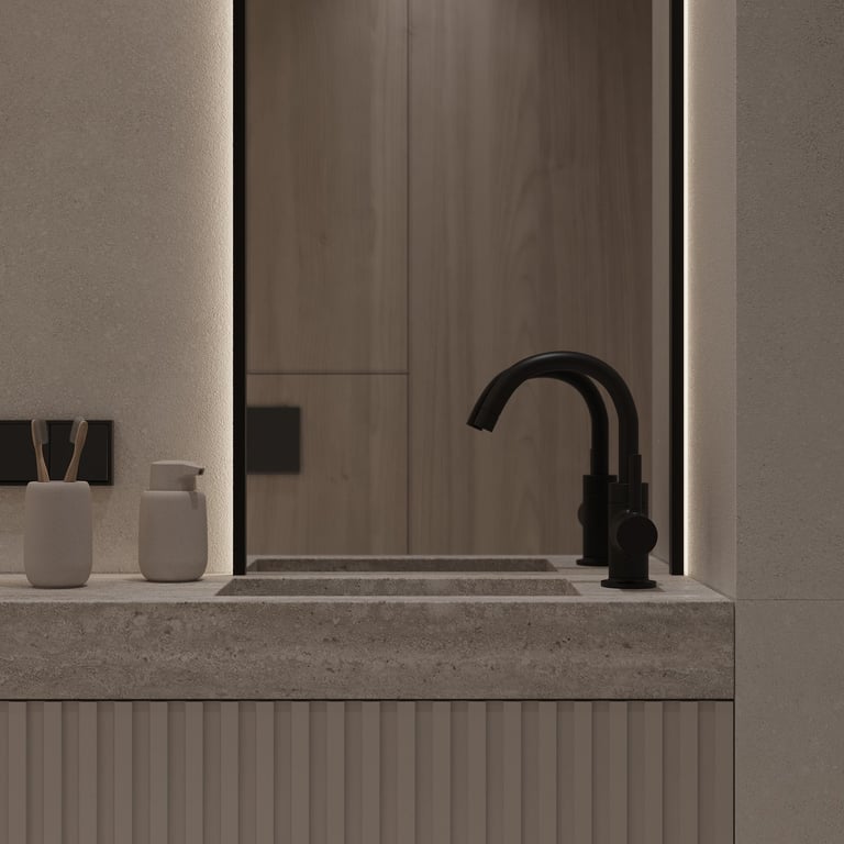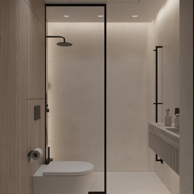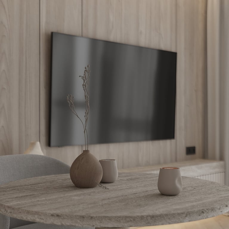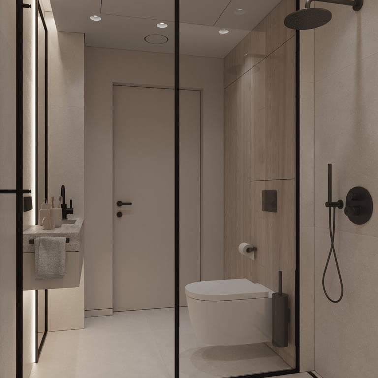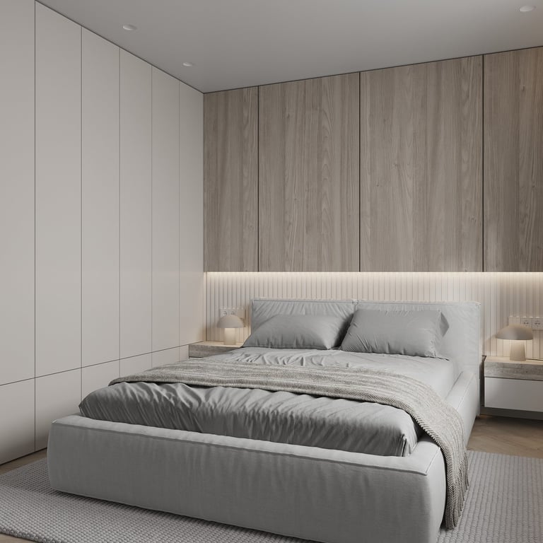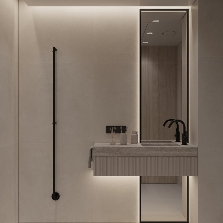 Monochrominis, minimalistinis, šviesių spalvų interjero projektas, kuriame duominuoja vertikalios linijos, suprojektuotos siekiant maksimaliai praplėsti buto erdvę. Interjere sienų dekorui naudojamos baldinės plokštės. Projekte vyrauja minimalistinės, juodos detalės ir minkšti, apvalių formų baldai, suteikiantys interjerui lengvumo ir švelnumo.