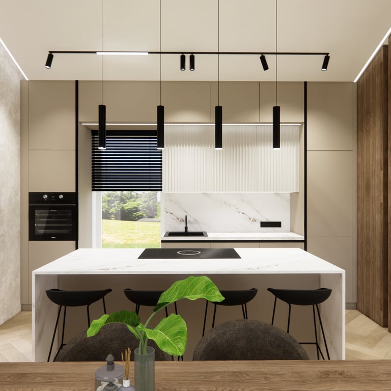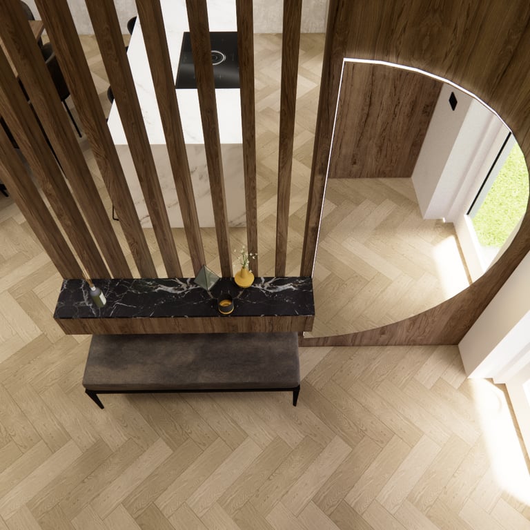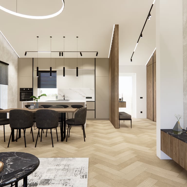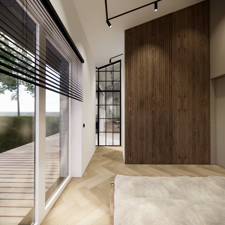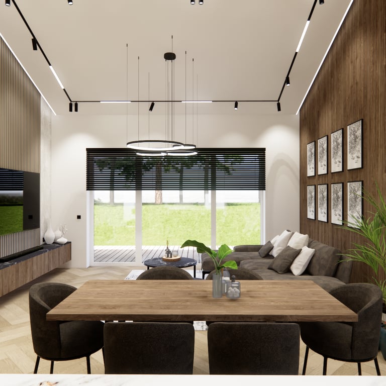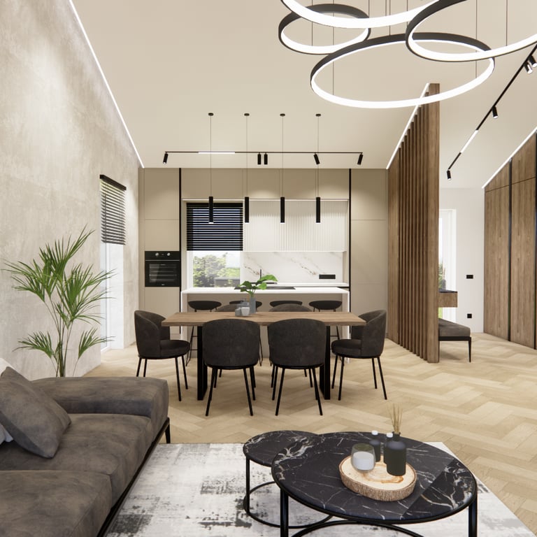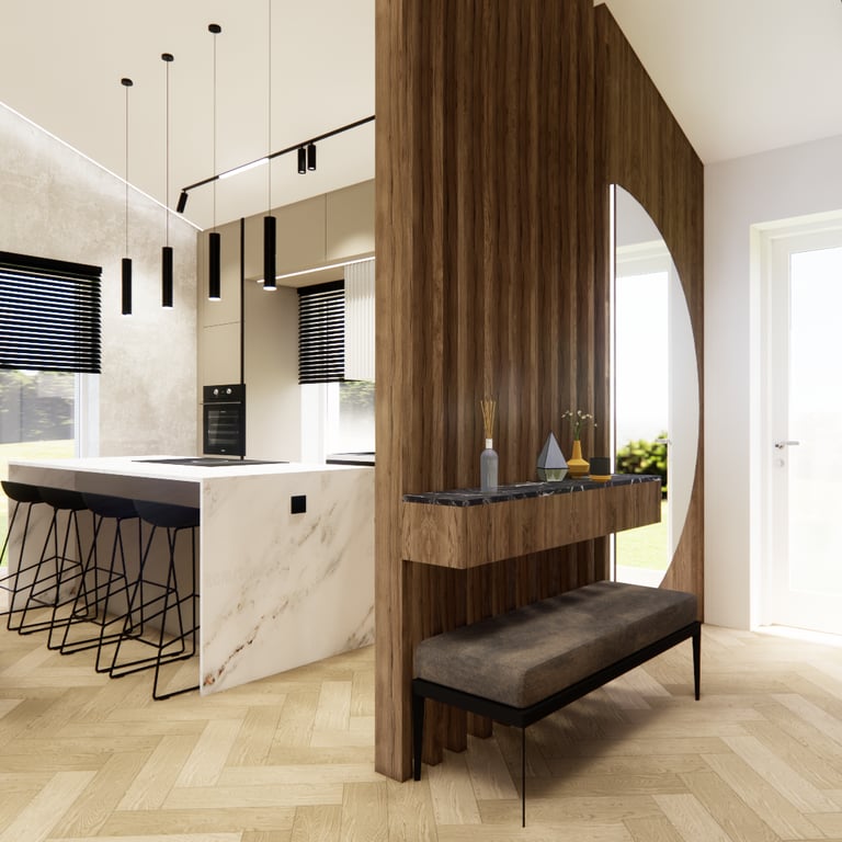 Šiame projekte siekėme sukurti kuo atviresnes ir jaukesnes erdves. Kadangi pirminis namo išplanavimas buvo daug uždaresnis ir pagrindinės namų erdvės būtų buvusios "užspaustos" perplanavome tiek svetainės virtuvės bei holo erdvę, tiek miegamuosius. Atsisakėme uždaro holo, jį nuo virtuvės atskyrėme tik lengva ažūrine pertvara. Padidinome svečių, vaikų san. mazgo ir katilinės patalpas. O atsisakius vieno iš papildomų kambarių suformavome privačią pagrindio miegamojo erdvę su atskira vonia bei drabužine.