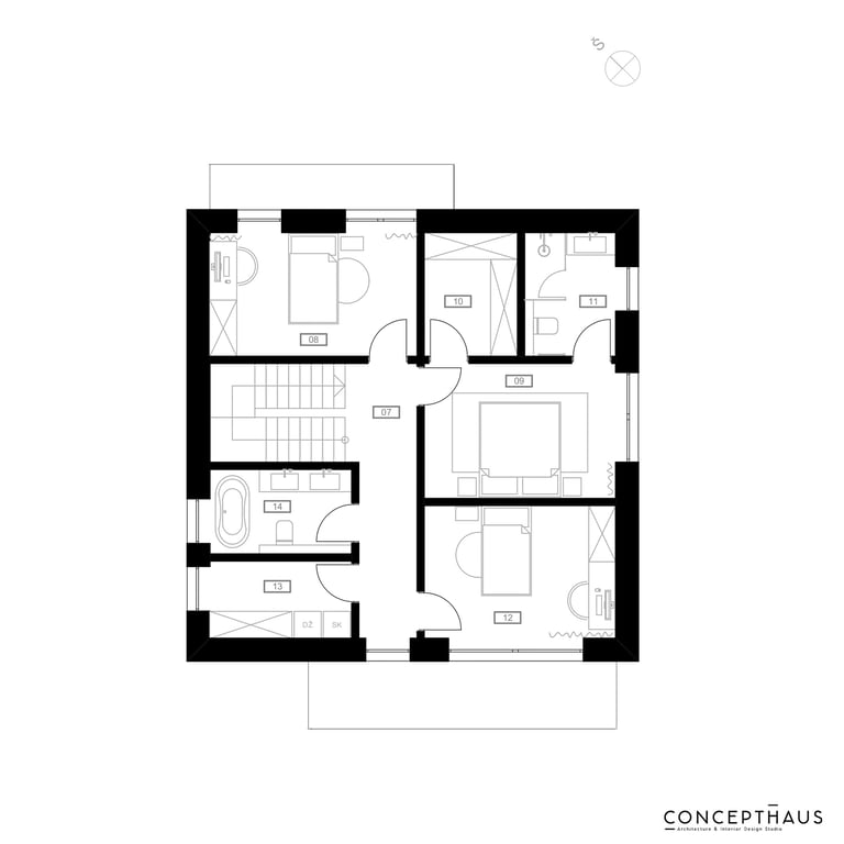 Pirmame pastato aukšte suplanuota svetainė su virtuve bei valgomuoju, darbo/svečių kambarys, nedidelis san. mazgas po laiptais, holas bei techninė patalpa. Antrame aukšte suprojektuoti du vaikų kambariai, vonia, skalbykla bei pagrindinio miegamojo zona su privačia vonia ir drabužine.