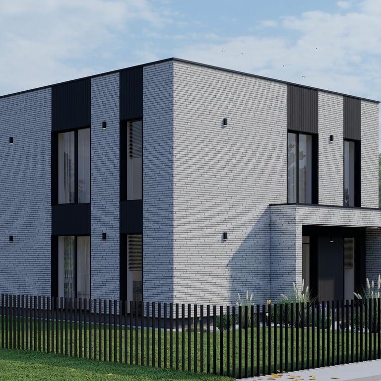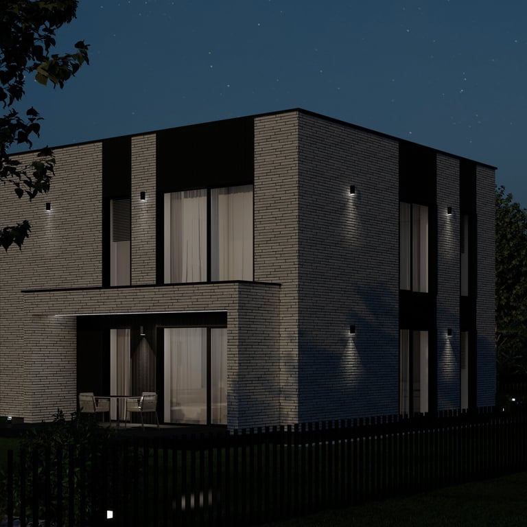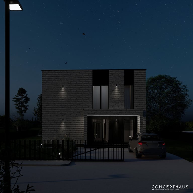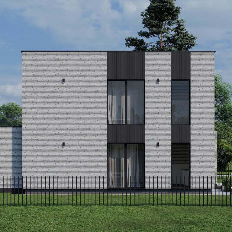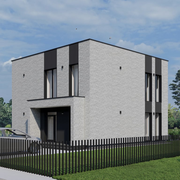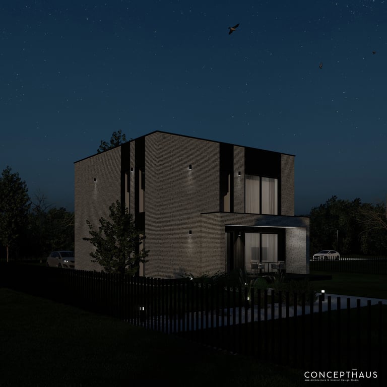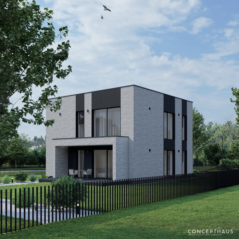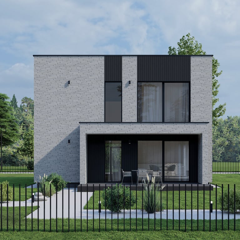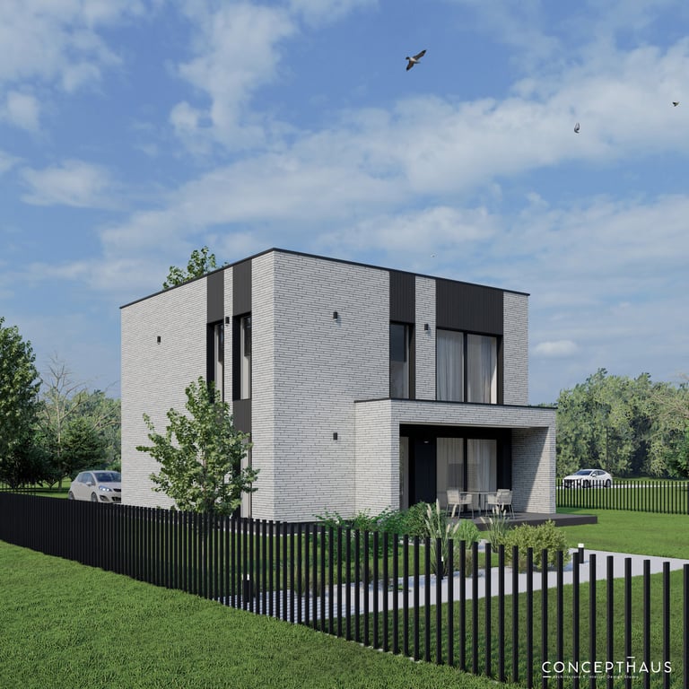 Dviejų aukštų gyvenamasis namas su 3 miegamaisiais ir pirmame aukšte numatytu darbo, svečių kambariu. Pastato išoriniai matmenys sudaro kvadratą 10x10m, o vizualiai tūris primena kubą, nors pastato aukštis numatytas kiek žemesnis. Prie pastato taip pat suplanuoti papildomi tūriai su stogeliais įėjimo bei terasos zonose.
