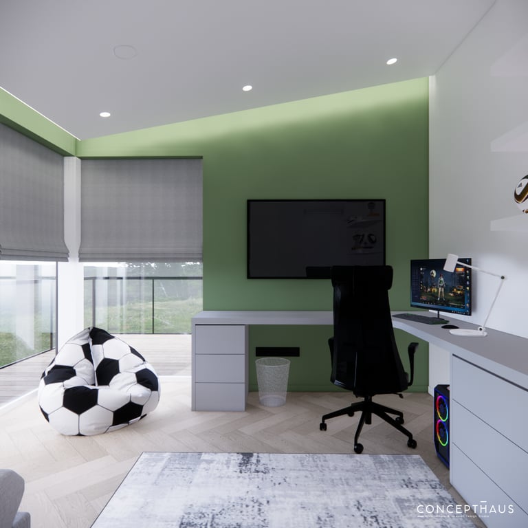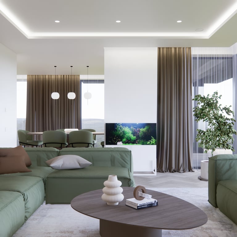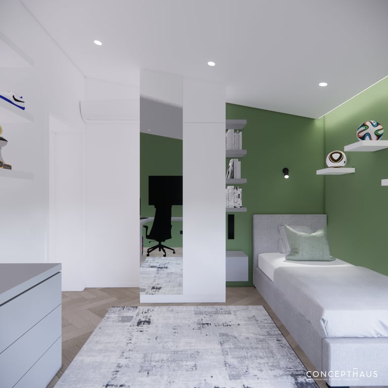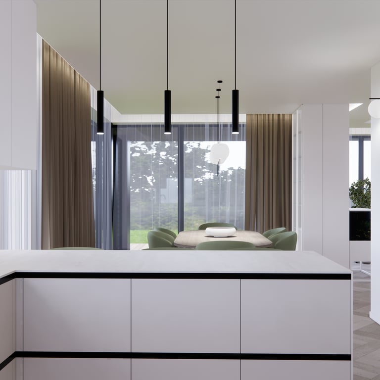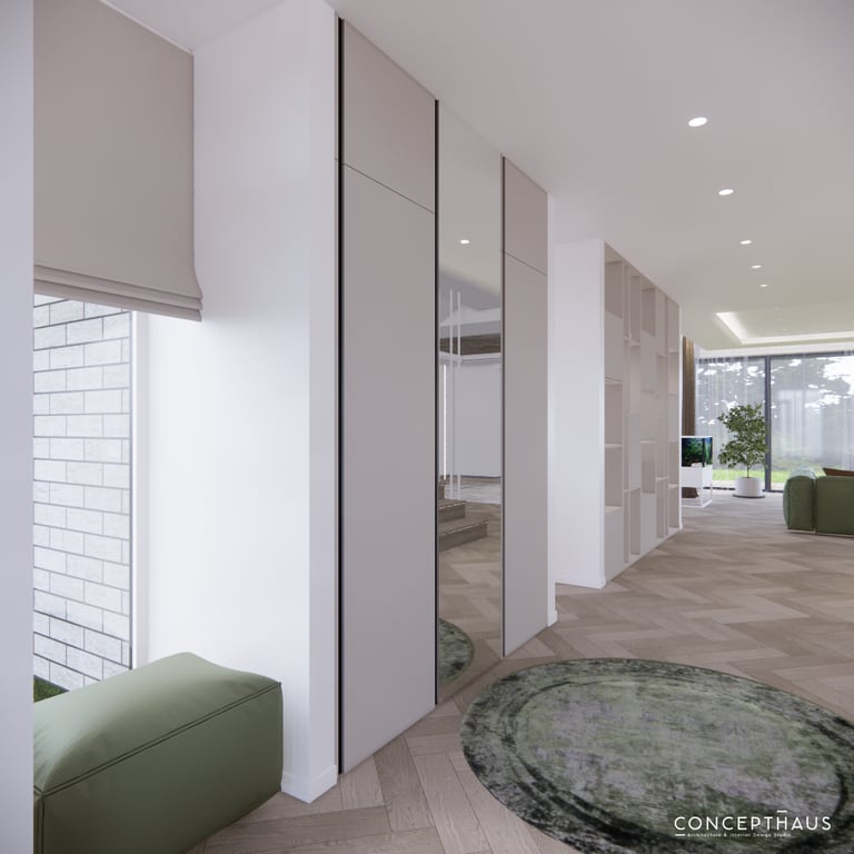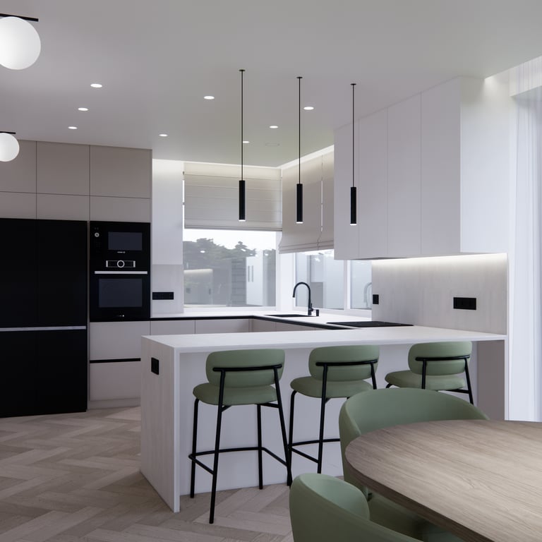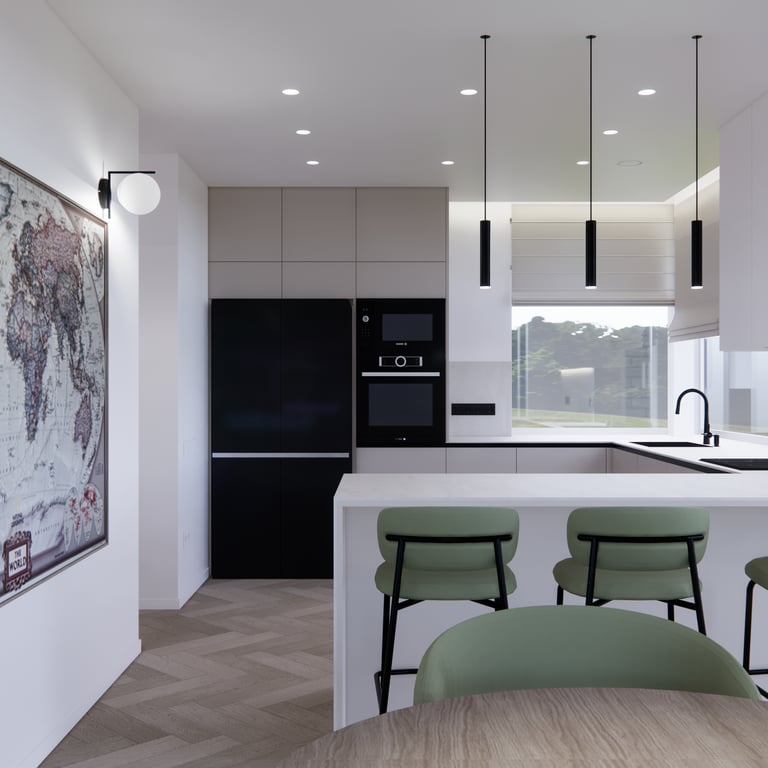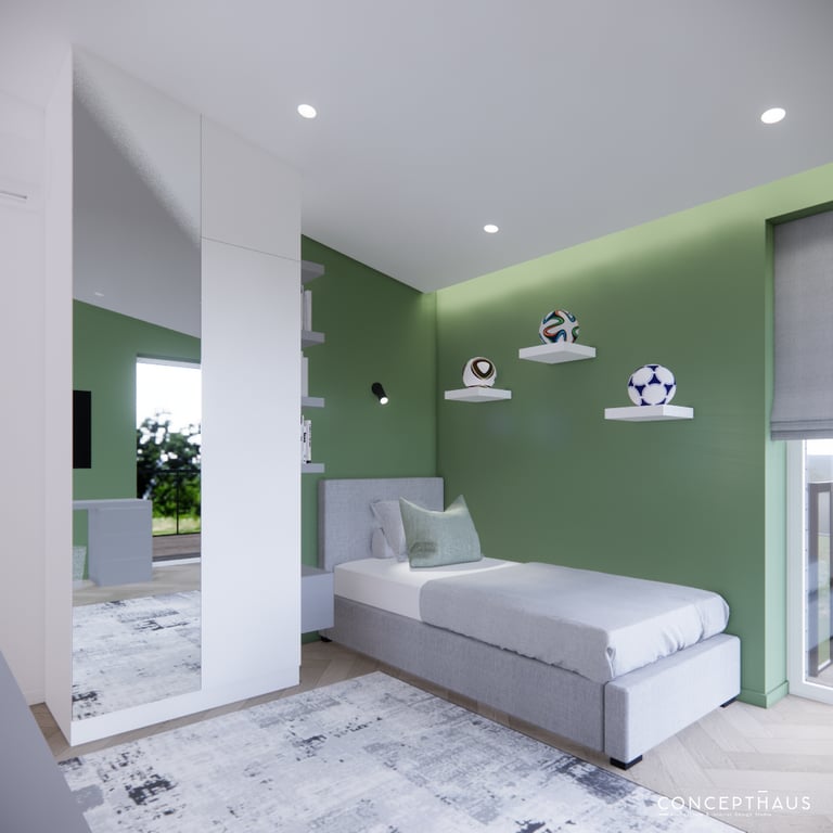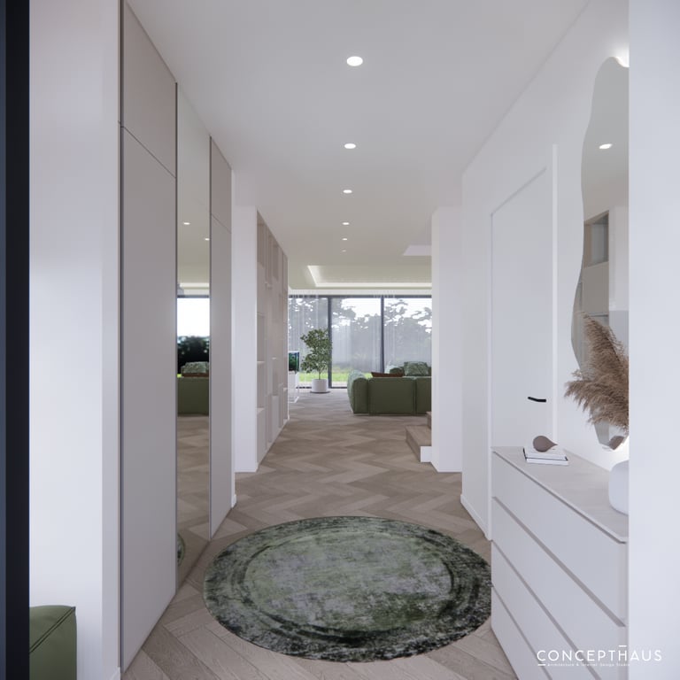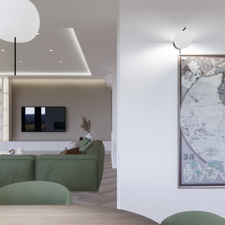 Jaukių, šviesių spalvų interjero projektas, kuriame dominuoja žalių bei rudų spalvų akcentai. Užsakovų noras buvo kiekvienoje namų erdvėje įnešti šiek tiek skirtingų spalvų. Interjeras sukurtas šeimai su dviems vaikais, pagal kurių poreikius bei pomėgus buvo suplanuoti jų spalvingi kambariai.