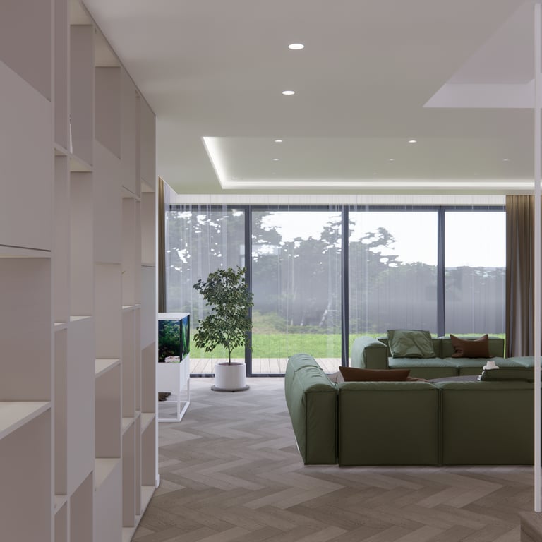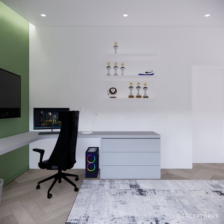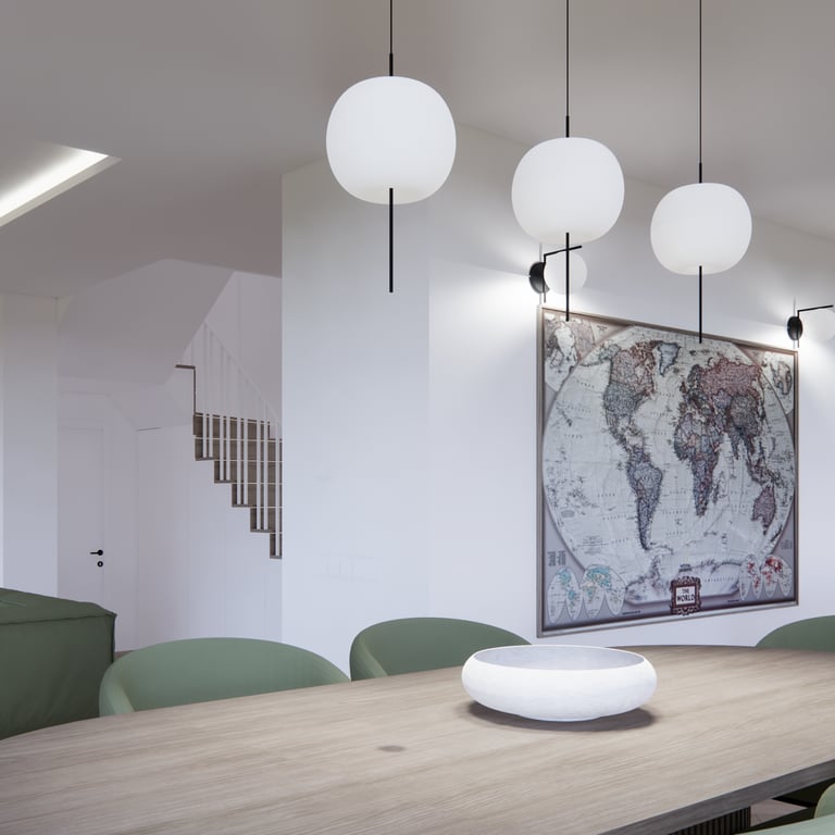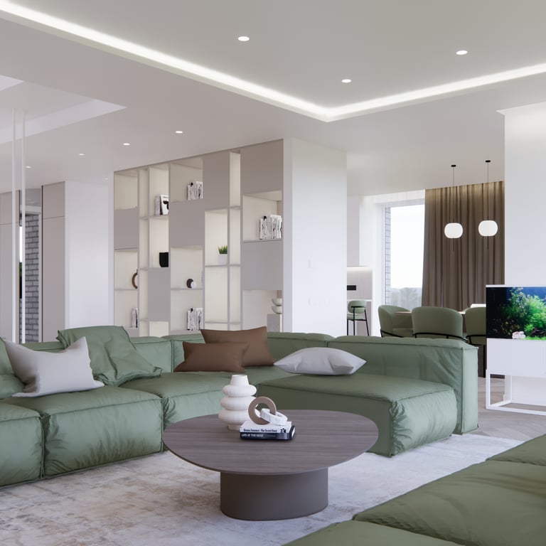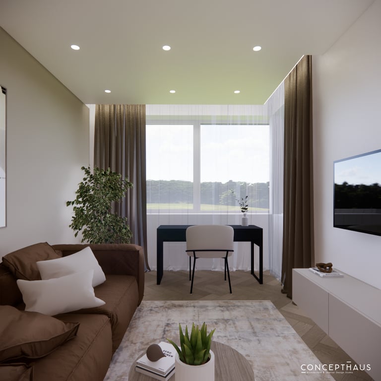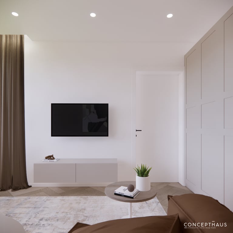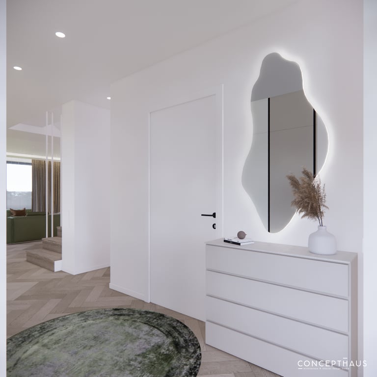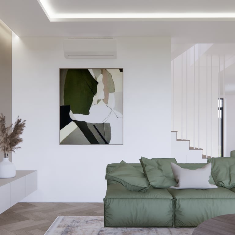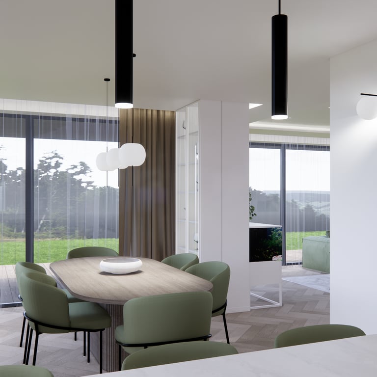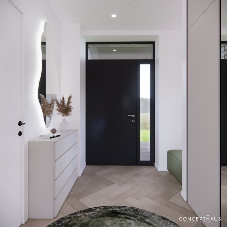 Jaukių, šviesių spalvų interjero projektas, kuriame dominuoja žalių bei rudų spalvų akcentai. Užsakovų noras buvo kiekvienoje namų erdvėje įnešti šiek tiek skirtingų spalvų. Interjeras sukurtas šeimai su dviems vaikais, pagal kurių poreikius bei pomėgus buvo suplanuoti jų spalvingi kambariai.