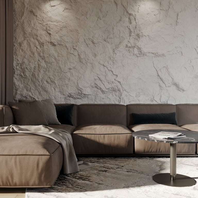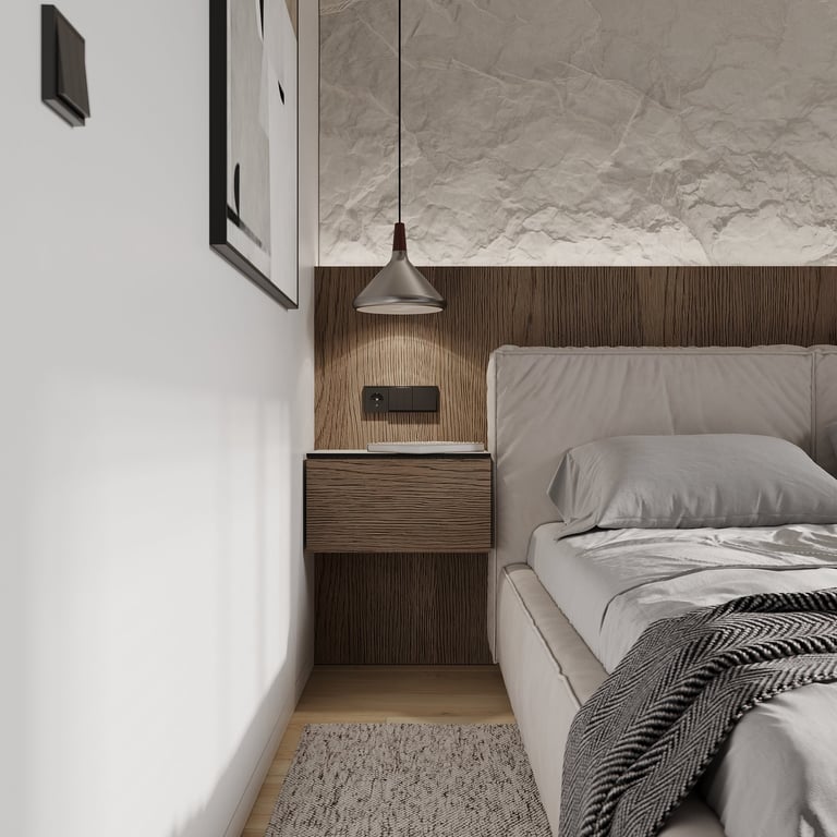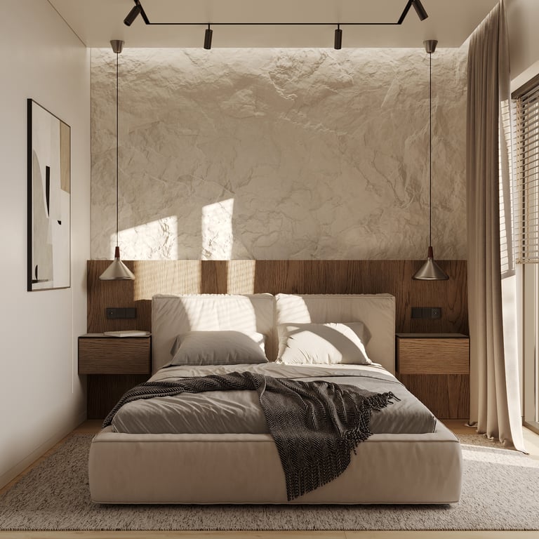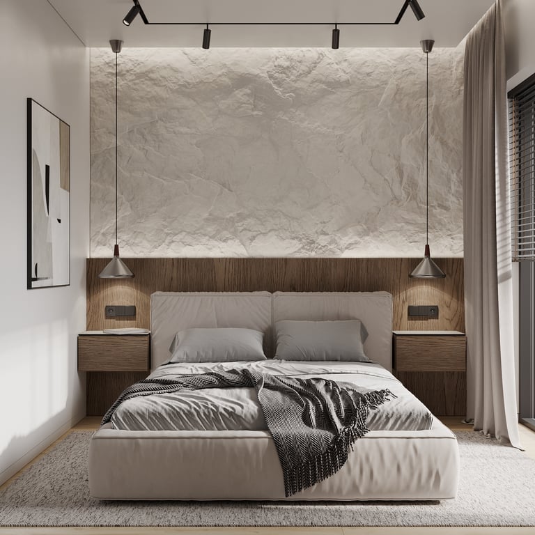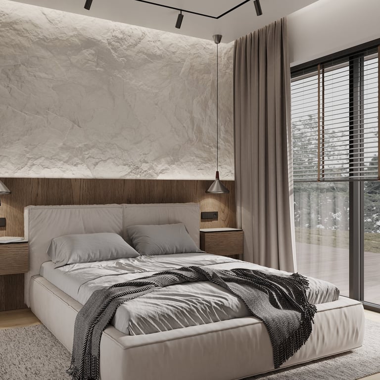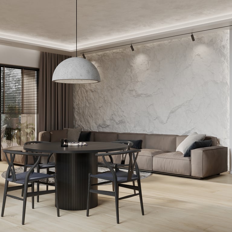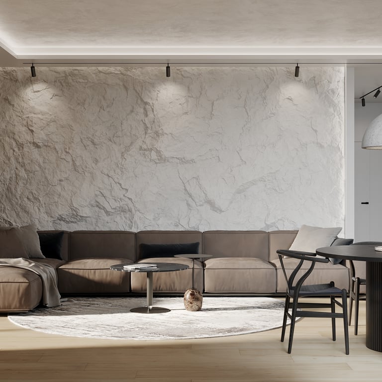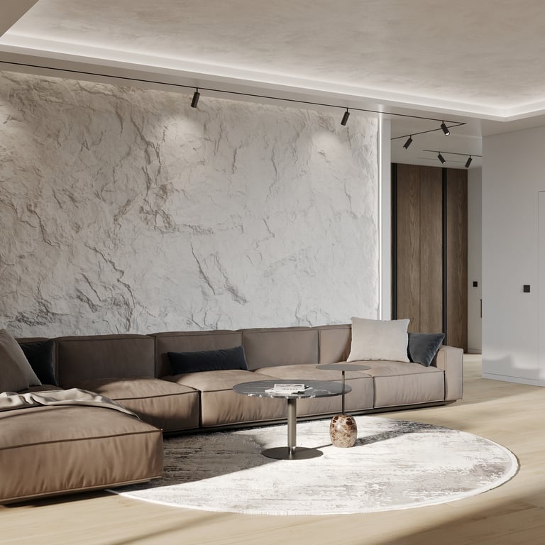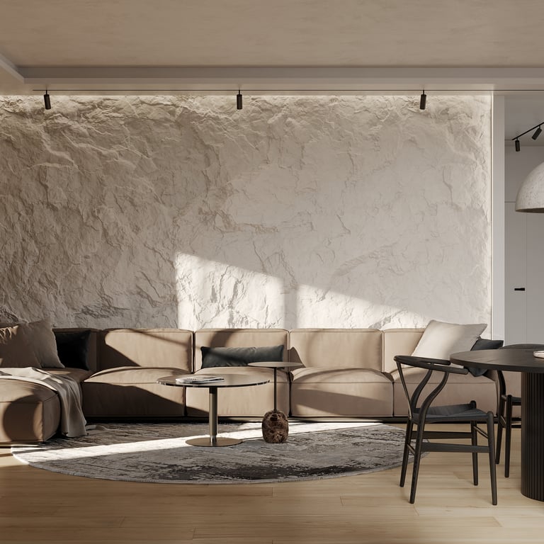 Šis interjero projektas išsiskiria netradicinių akmens imitacijos dekoro sienų panaudojimu interjere. Šis sprendimas atsikartoja visose pagrindinėse namų erdvėse (svetainėje, miegamajame, netgi vonioje). Interjere vyrauja šviesios spalvos (balta, pilka, smėlinė), betono, akmens dekoras ir daug medžio, naudojamo visiems pagrindiniams korpusiniams baldams ir sienų dekorui.