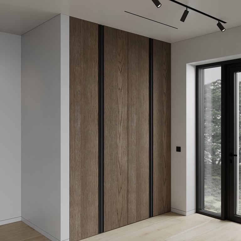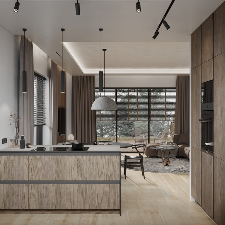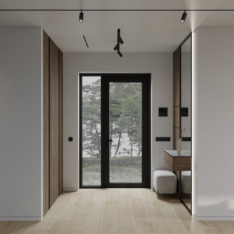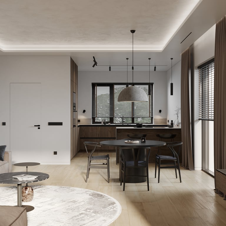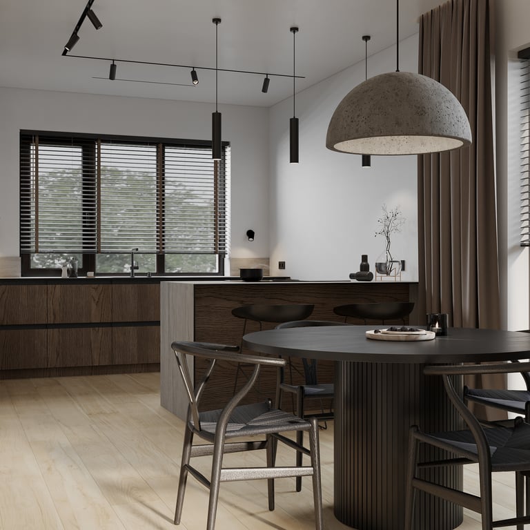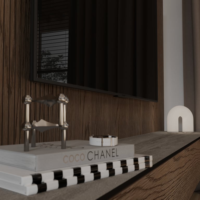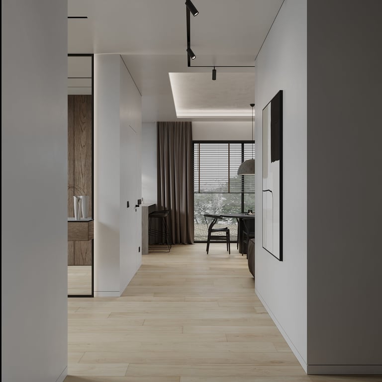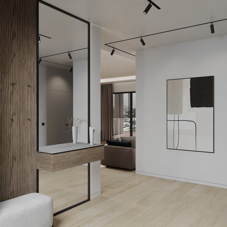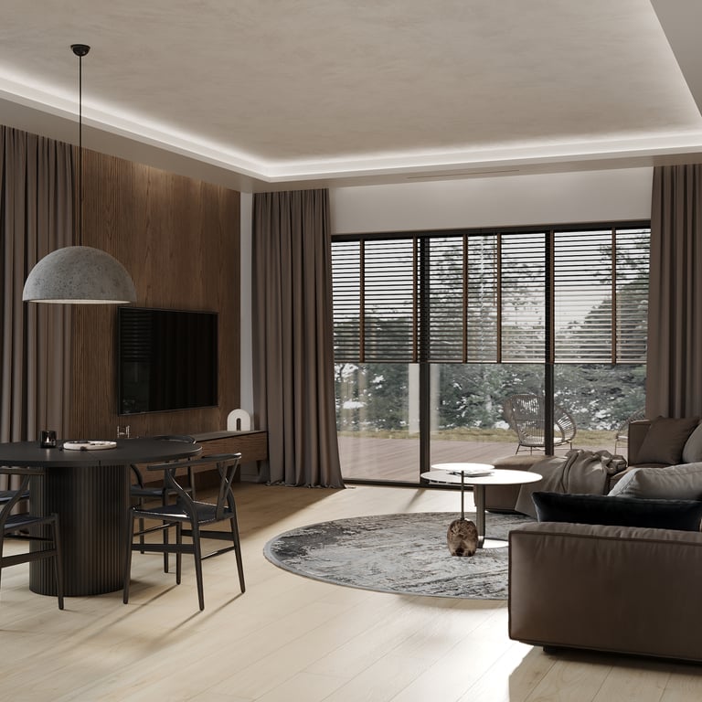 Šis interjero projektas išsiskiria netradicinių akmens imitacijos dekoro sienų panaudojimu interjere. Šis sprendimas atsikartoja visose pagrindinėse namų erdvėse (svetainėje, miegamajame, netgi vonioje). Interjere vyrauja šviesios spalvos (balta, pilka, smėlinė), betono, akmens dekoras ir daug medžio, naudojamo visiems pagrindiniams korpusiniams baldams ir sienų dekorui.