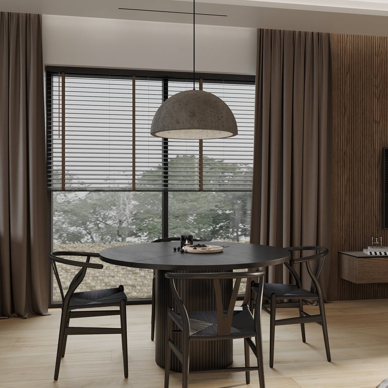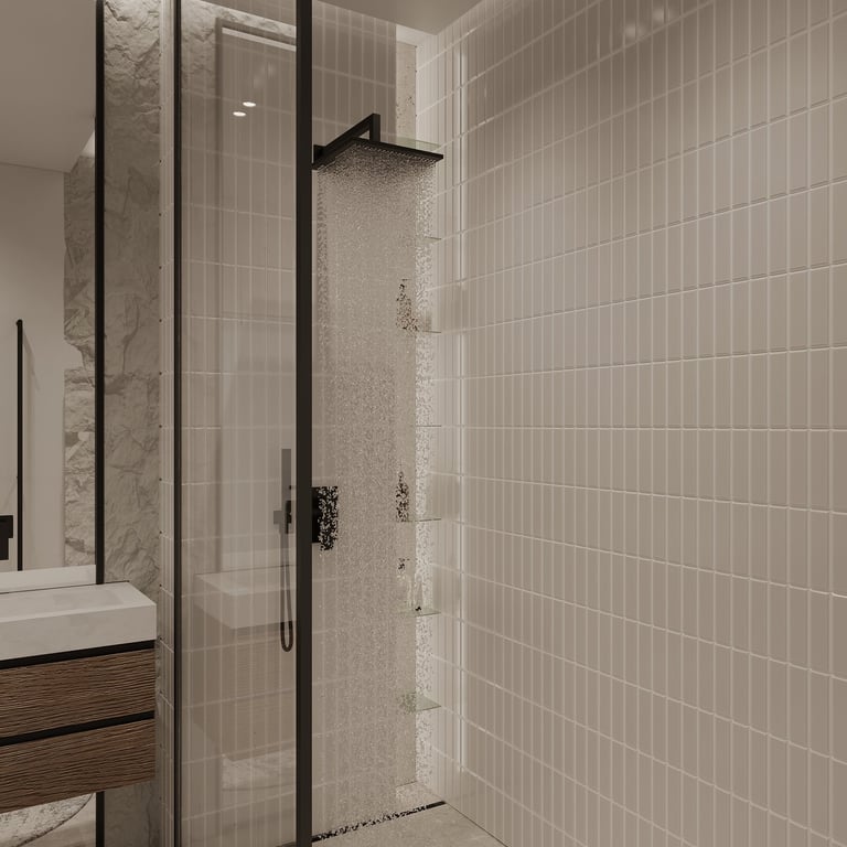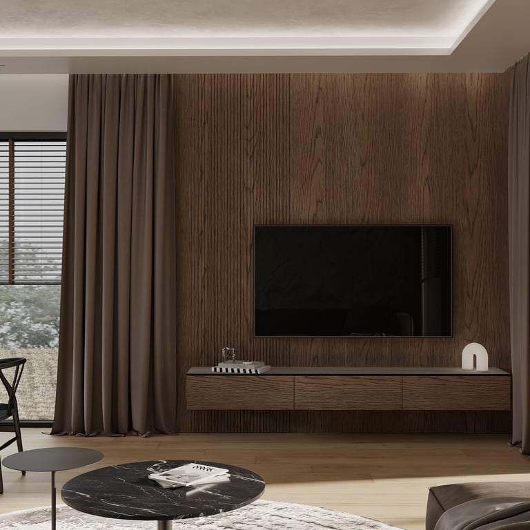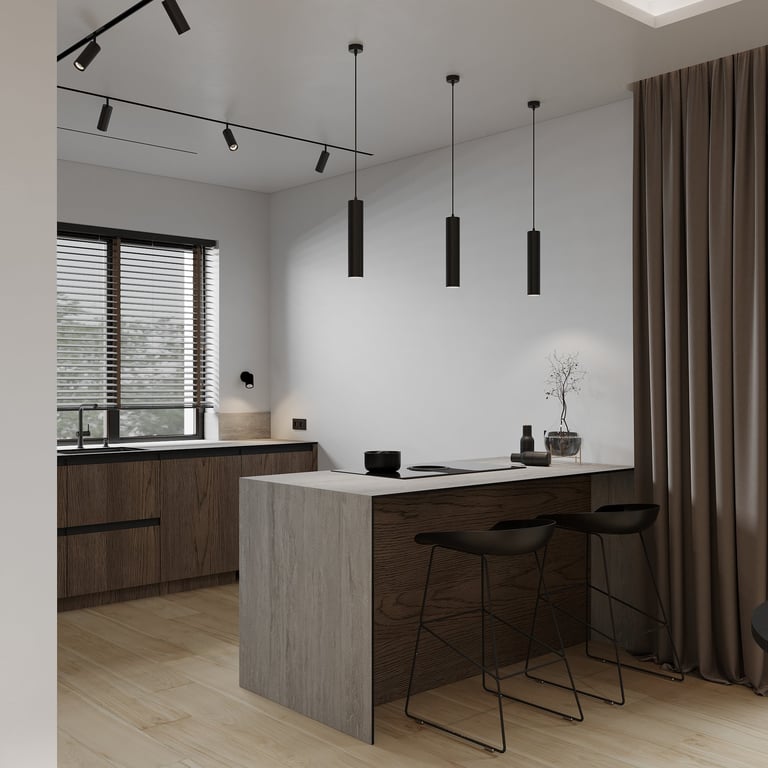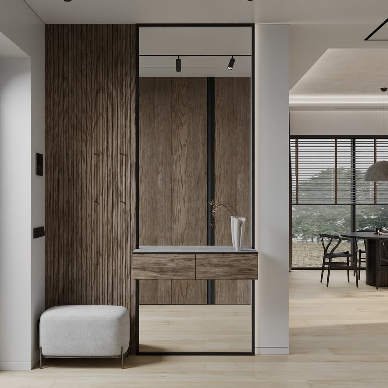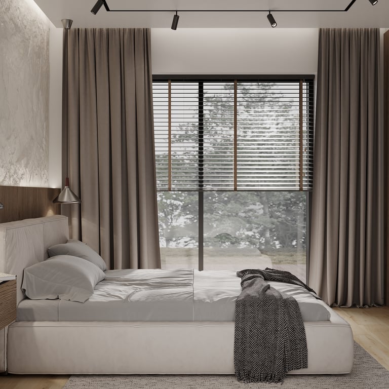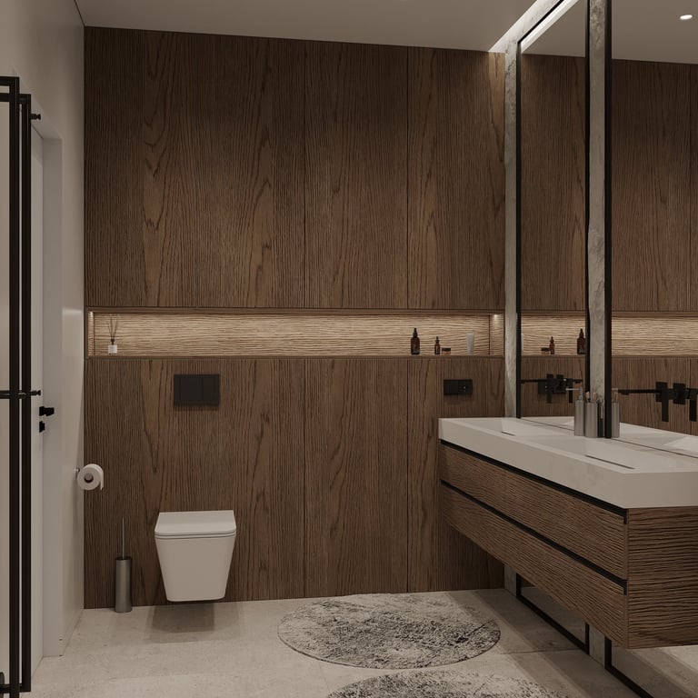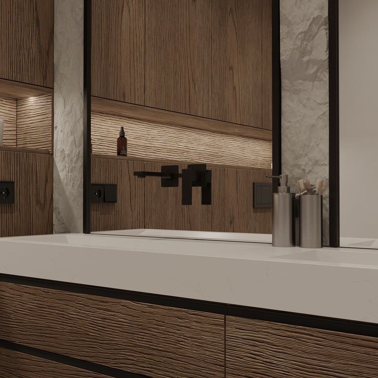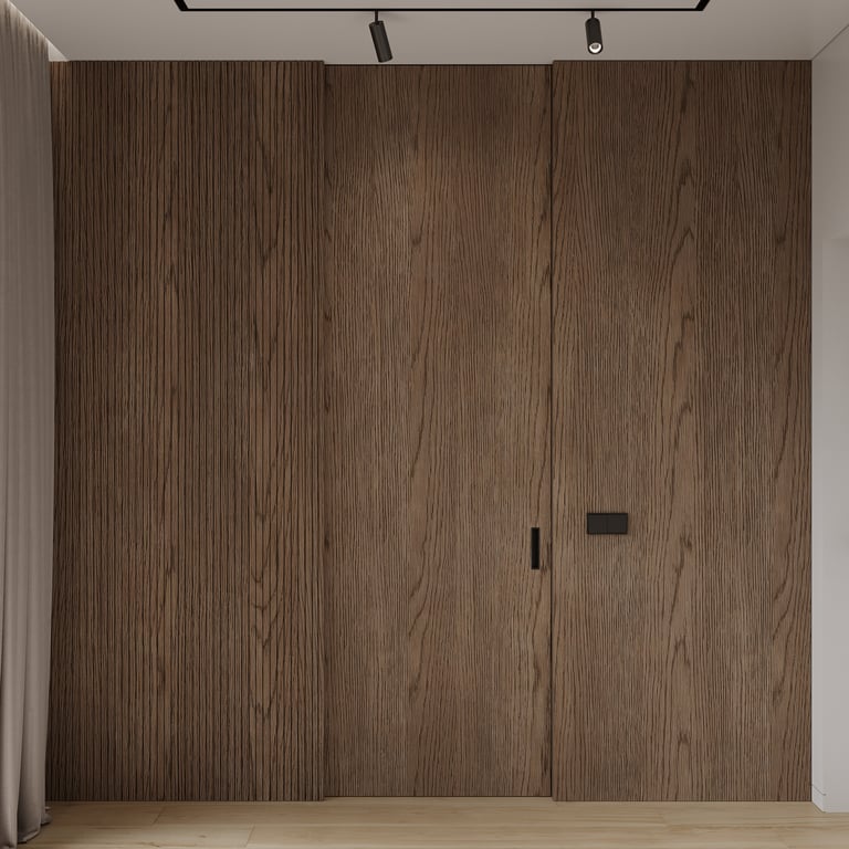 Šis interjero projektas išsiskiria netradicinių akmens imitacijos dekoro sienų panaudojimu interjere. Šis sprendimas atsikartoja visose pagrindinėse namų erdvėse (svetainėje, miegamajame, netgi vonioje). Interjere vyrauja šviesios spalvos (balta, pilka, smėlinė), betono, akmens dekoras ir daug medžio, naudojamo visiems pagrindiniams korpusiniams baldams ir sienų dekorui.