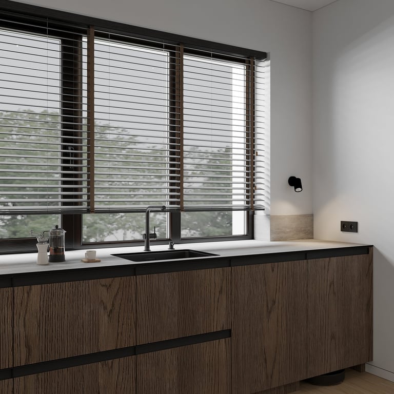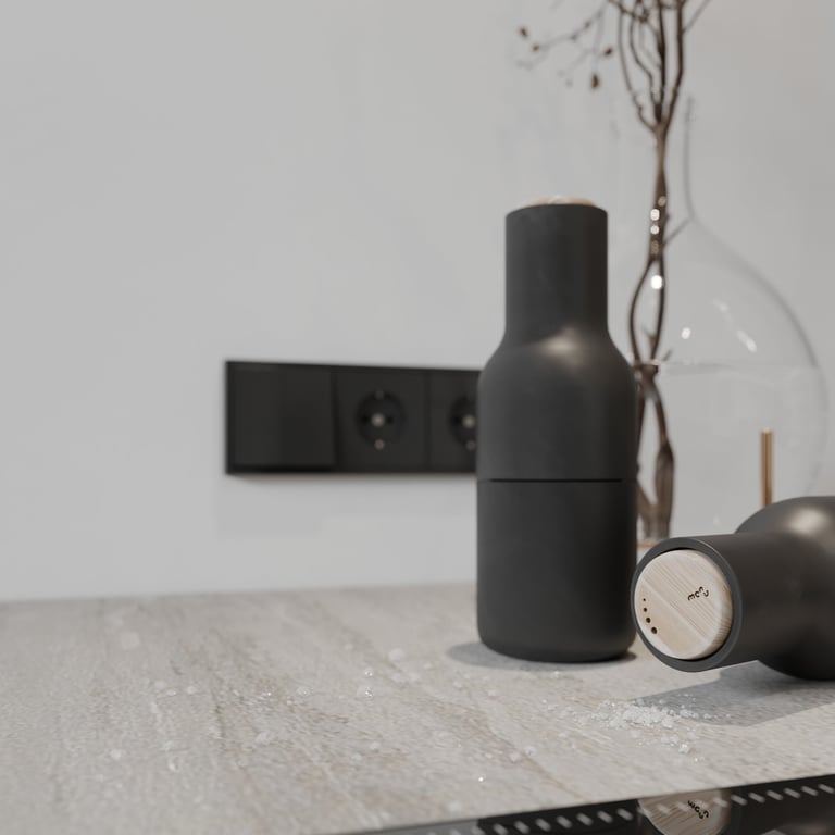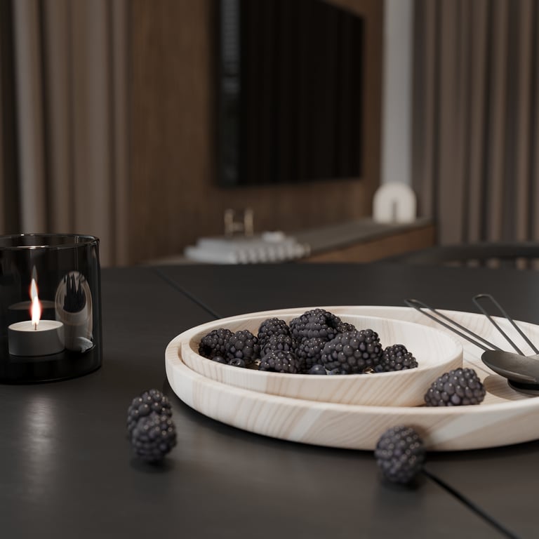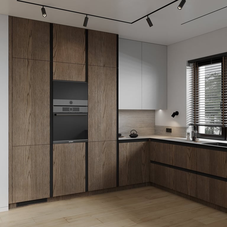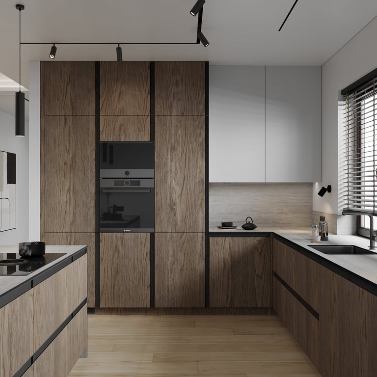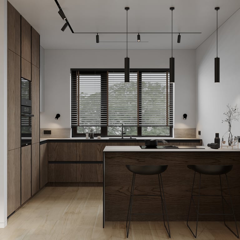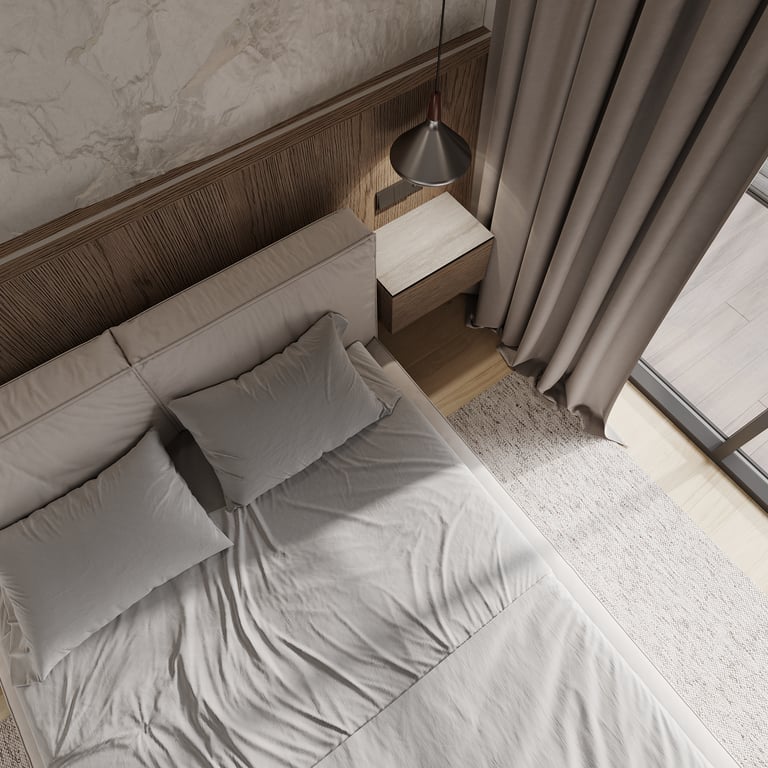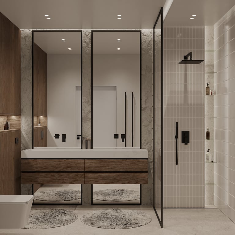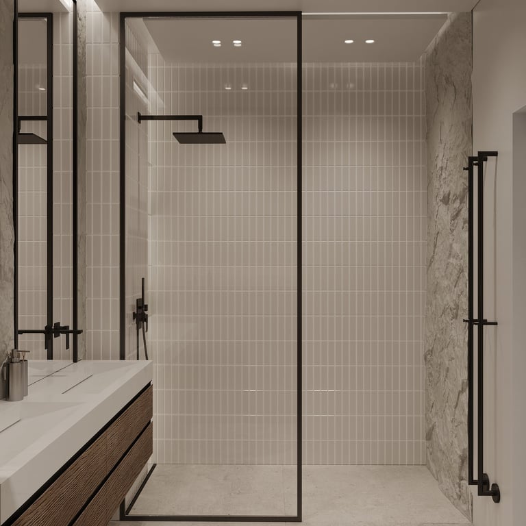 Šis interjero projektas išsiskiria netradicinių akmens imitacijos dekoro sienų panaudojimu interjere. Šis sprendimas atsikartoja visose pagrindinėse namų erdvėse (svetainėje, miegamajame, netgi vonioje). Interjere vyrauja šviesios spalvos (balta, pilka, smėlinė), betono, akmens dekoras ir daug medžio, naudojamo visiems pagrindiniams korpusiniams baldams ir sienų dekorui.