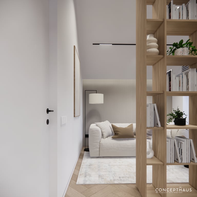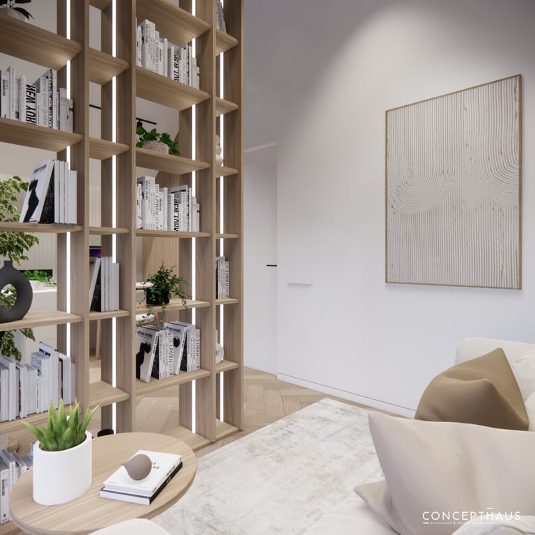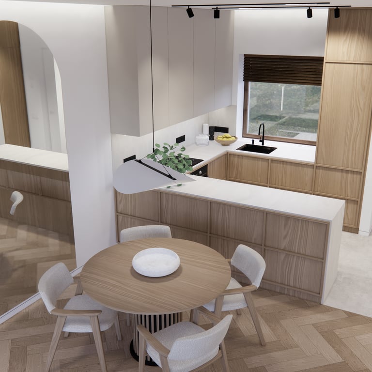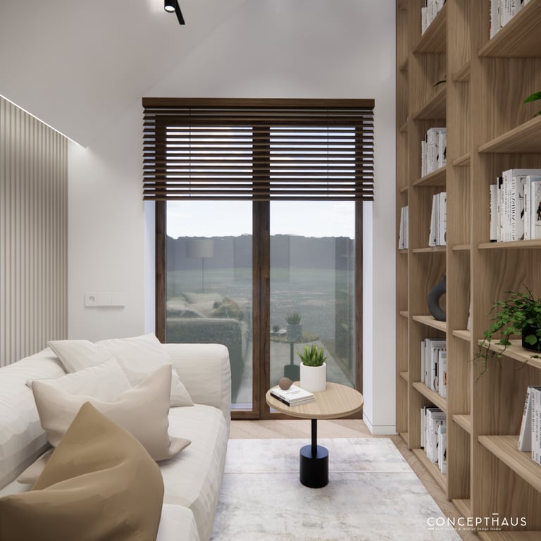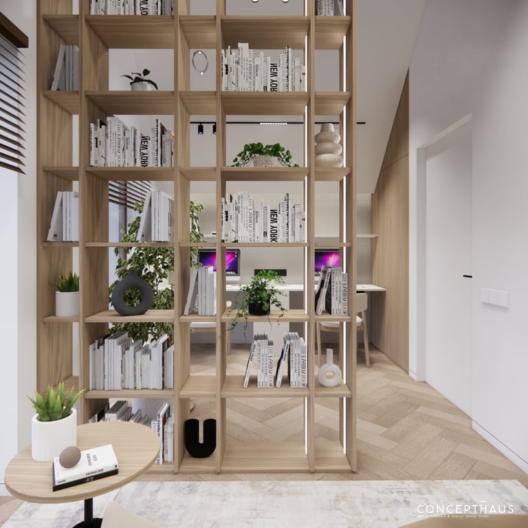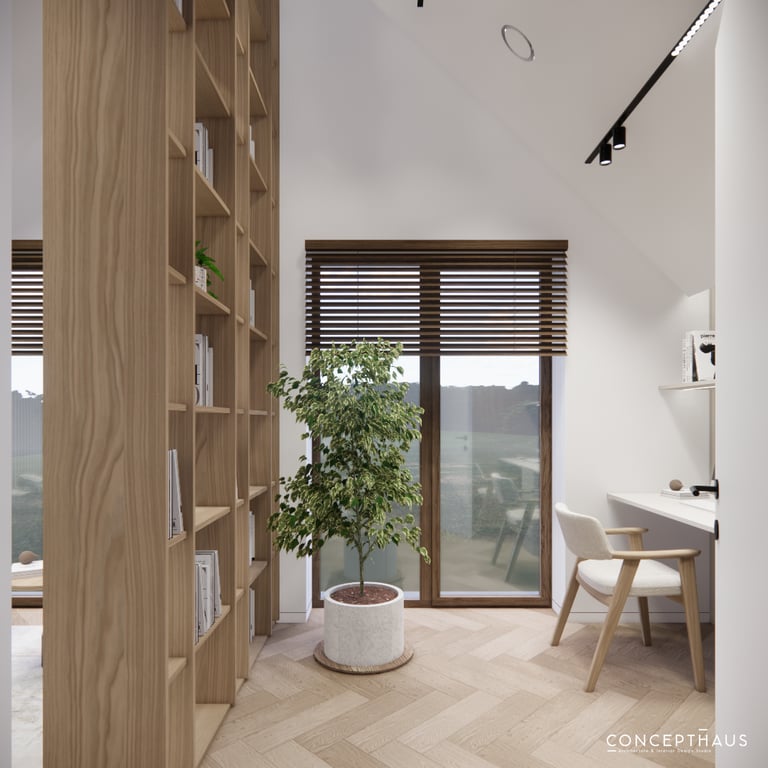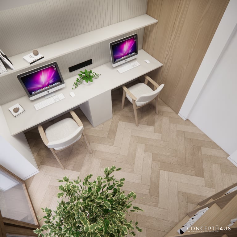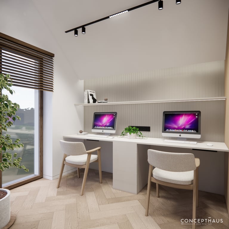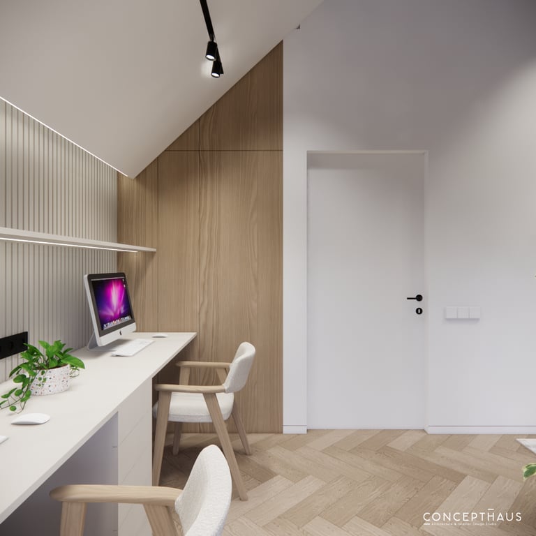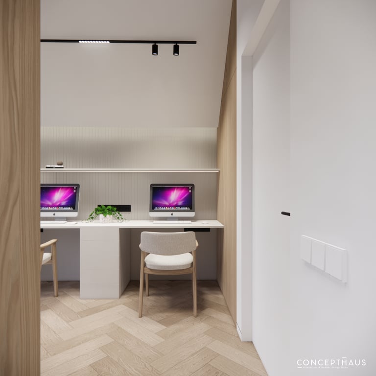 Interjero projektas, kuriame dominuoja medis, apvalios, lenktos formos ir šviesios spalvos. Interjeras sukurtas porai namuose norinčiai turėti patogią darbo zoną dviems asmenims.