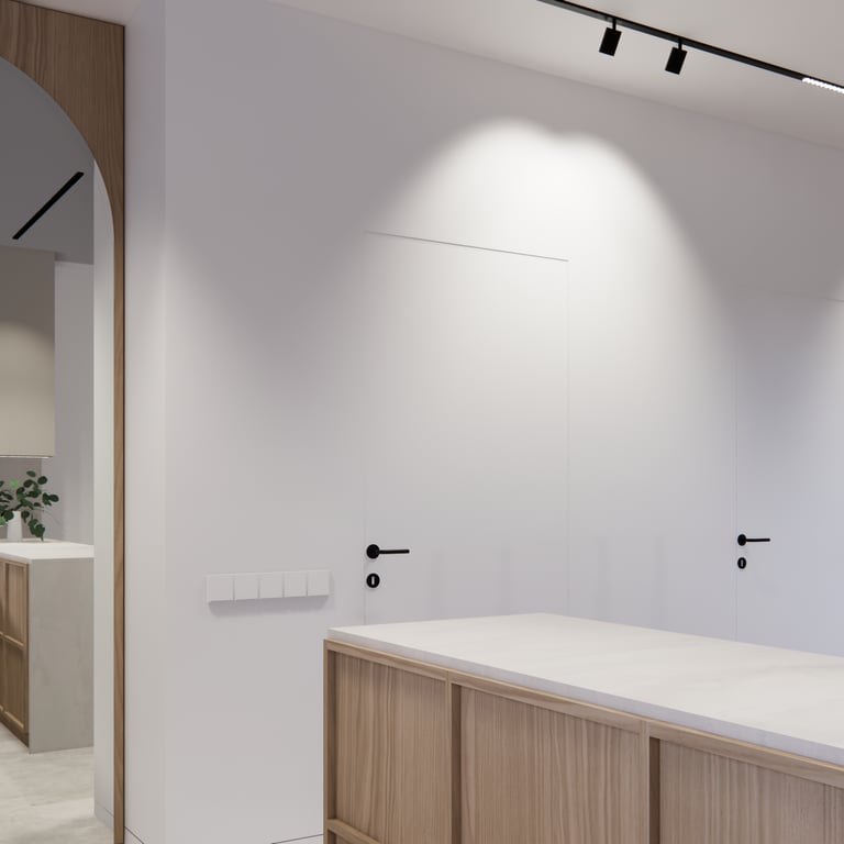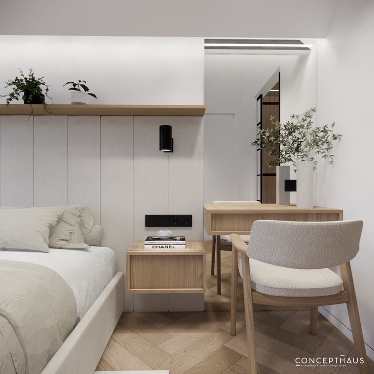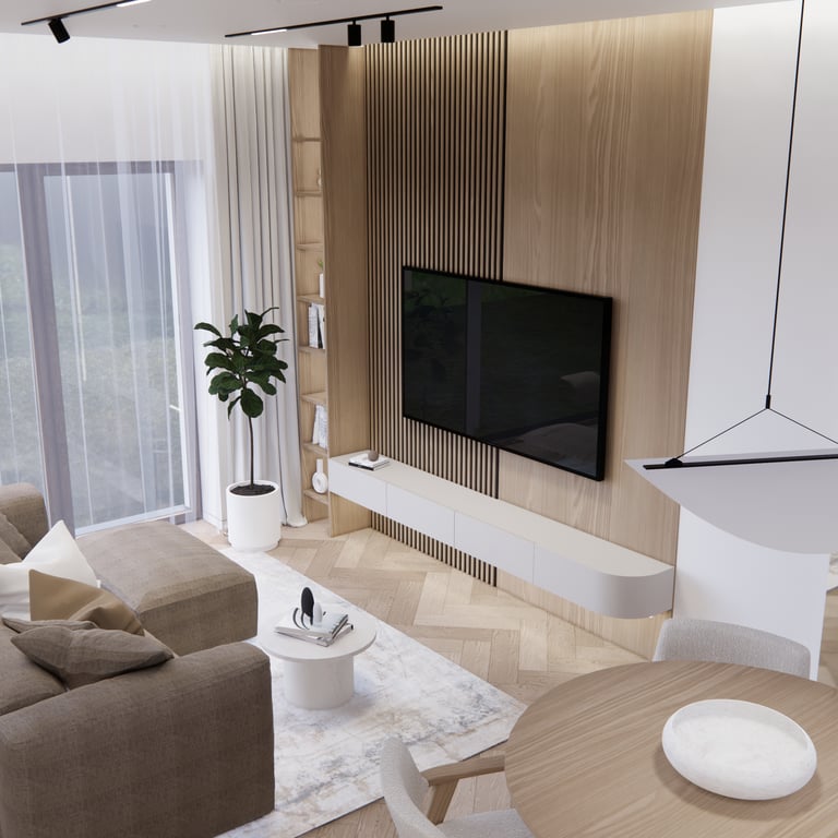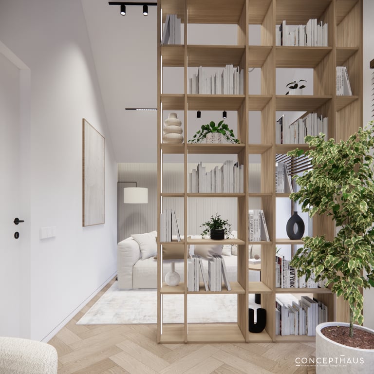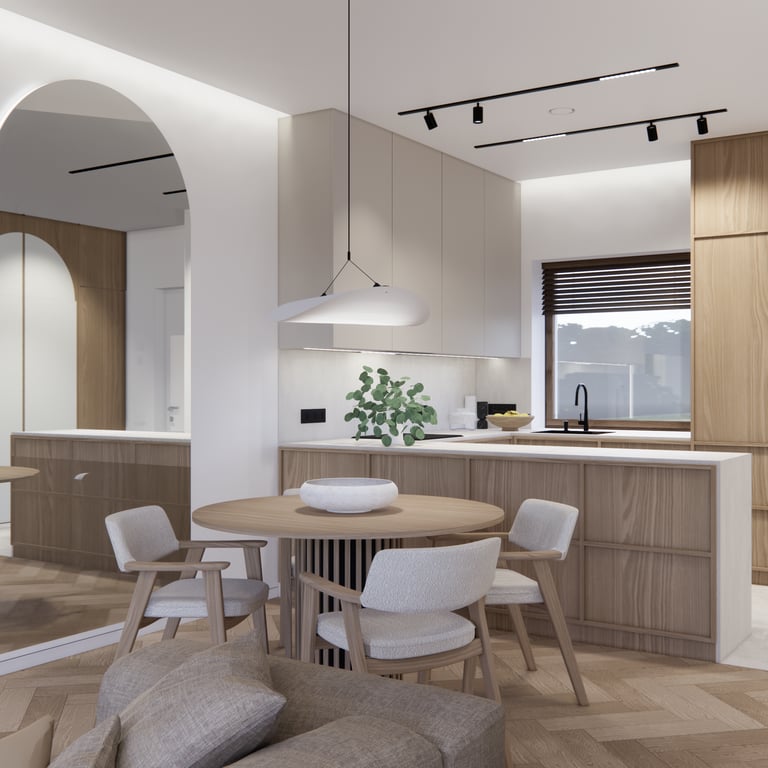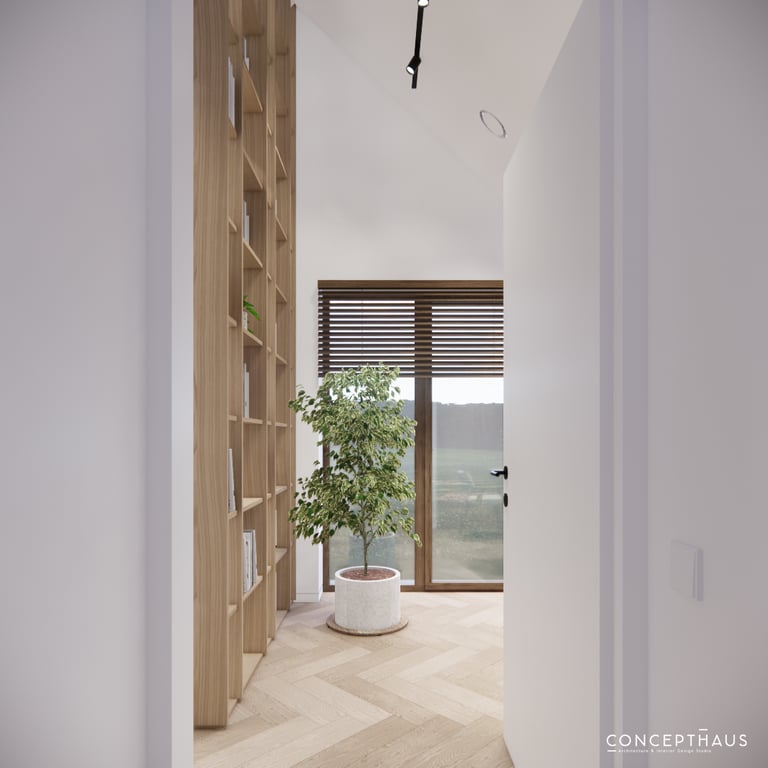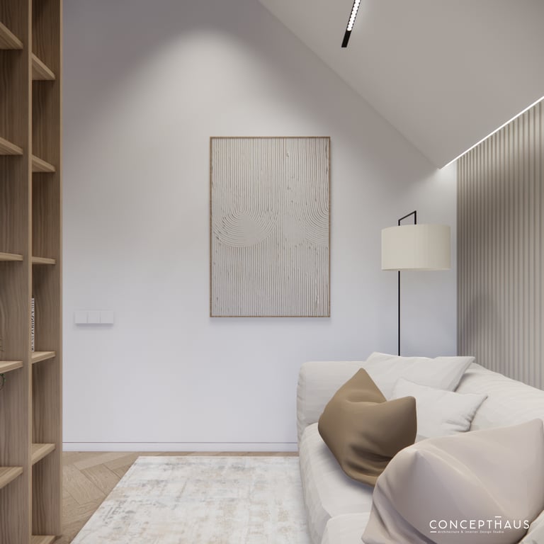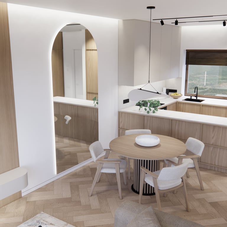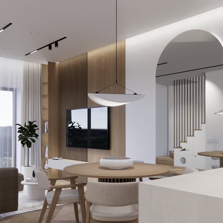 Interjero projektas, kuriame dominuoja medis, apvalios, lenktos formos ir šviesios spalvos. Interjeras sukurtas porai namuose norinčiai turėti patogią darbo zoną dviems asmenims.
