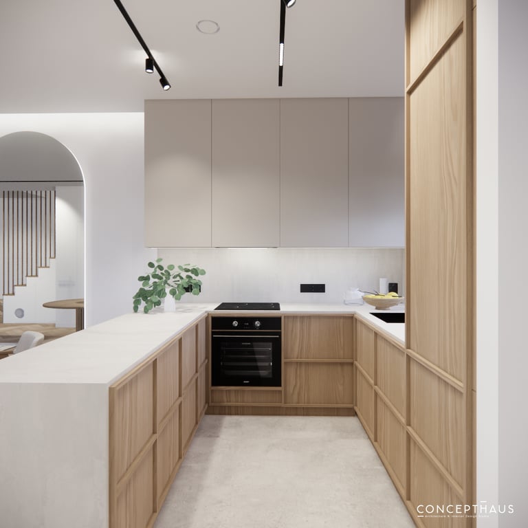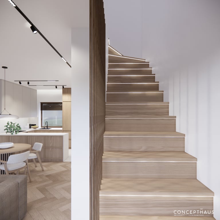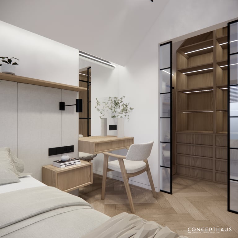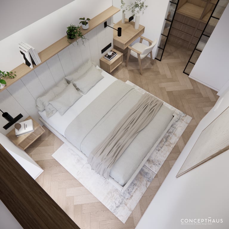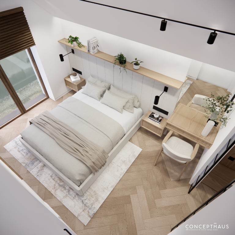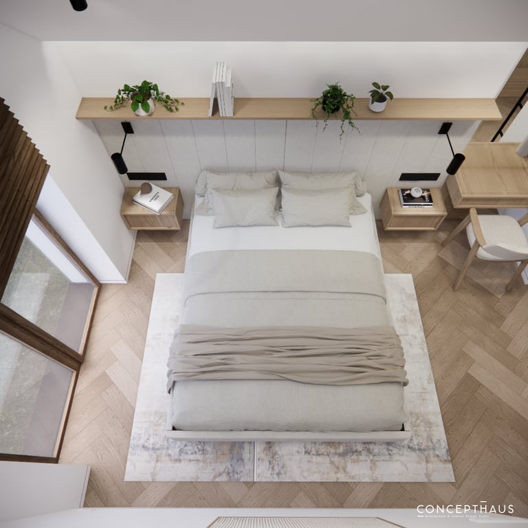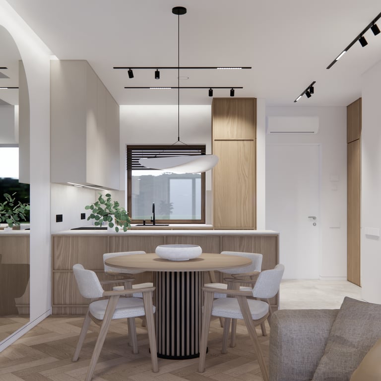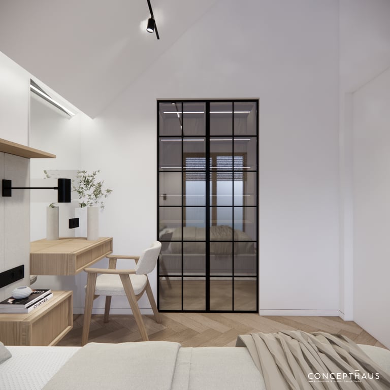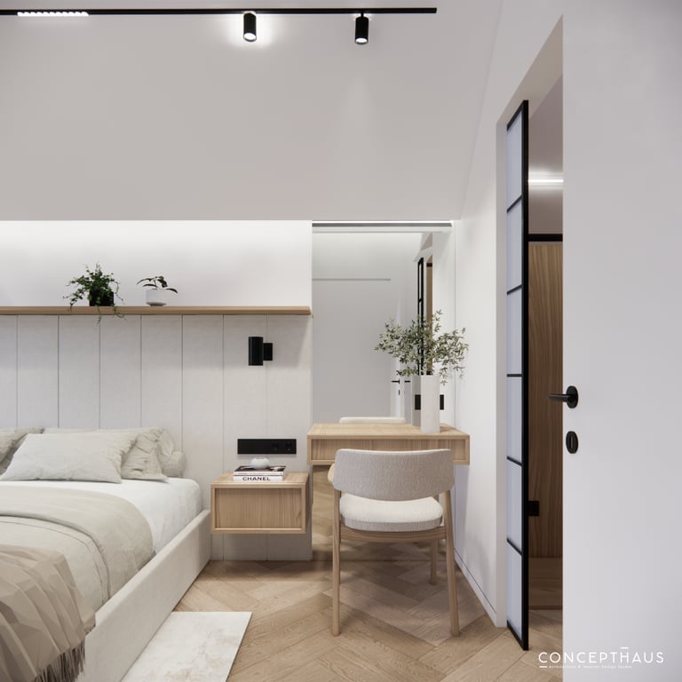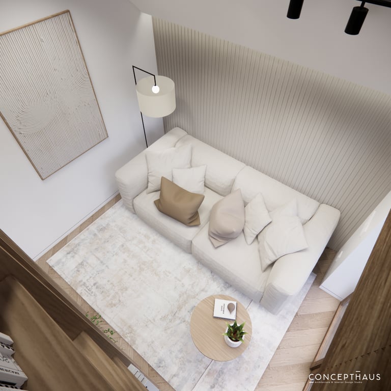 Interjero projektas, kuriame dominuoja medis, apvalios, lenktos formos ir šviesios spalvos. Interjeras sukurtas porai namuose norinčiai turėti patogią darbo zoną dviems asmenims.