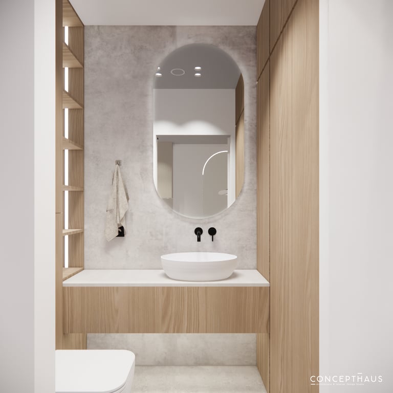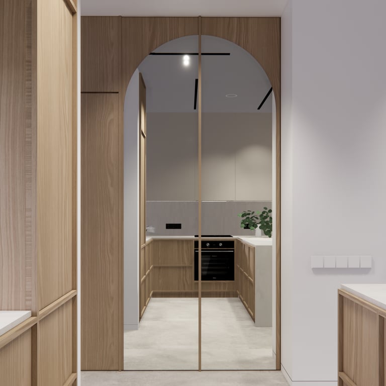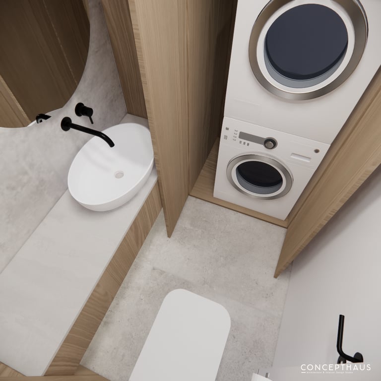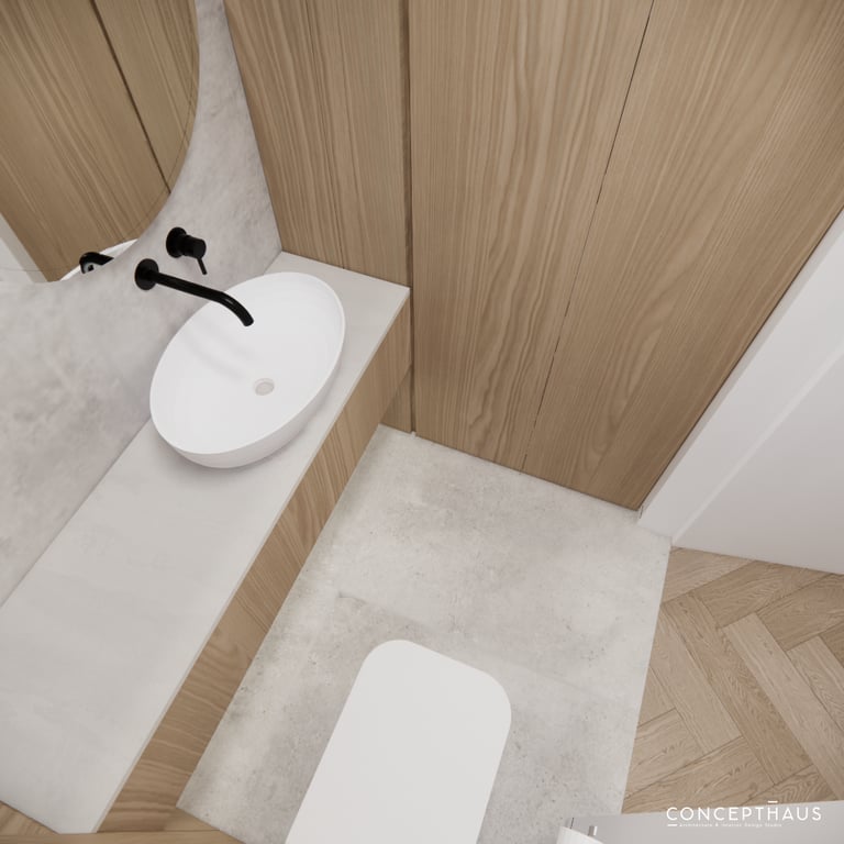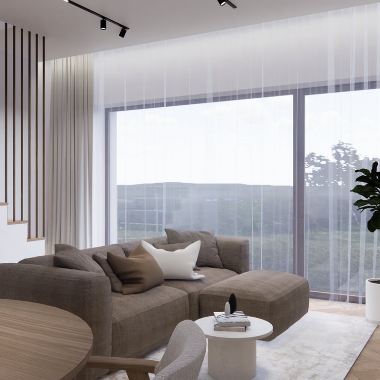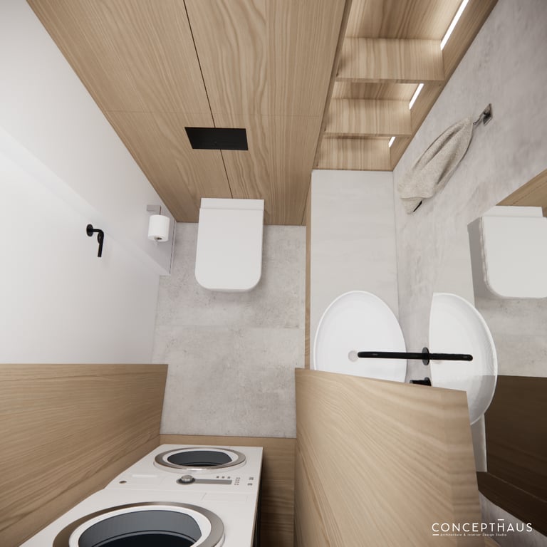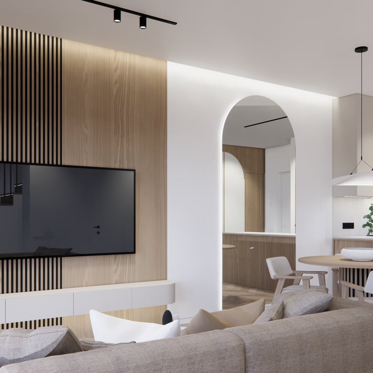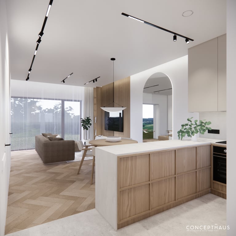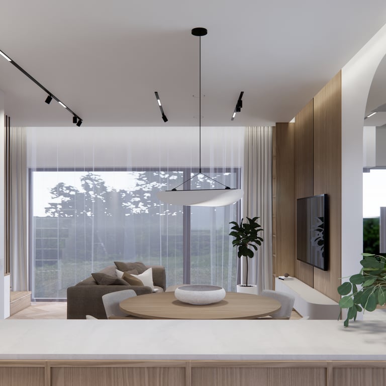 Interjero projektas, kuriame dominuoja medis, apvalios, lenktos formos ir šviesios spalvos. Interjeras sukurtas porai namuose norinčiai turėti patogią darbo zoną dviems asmenims.