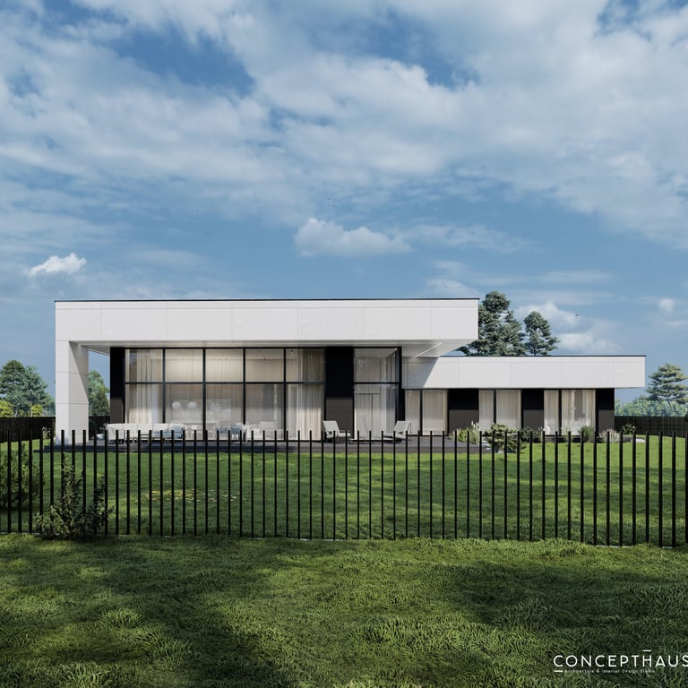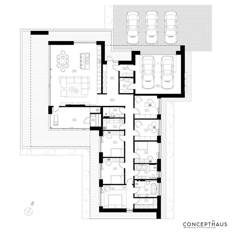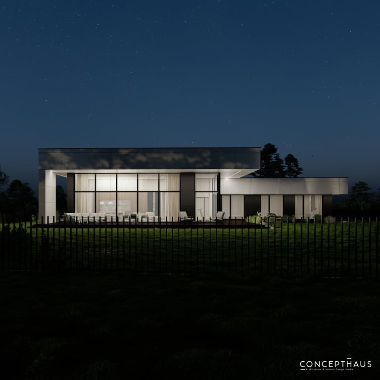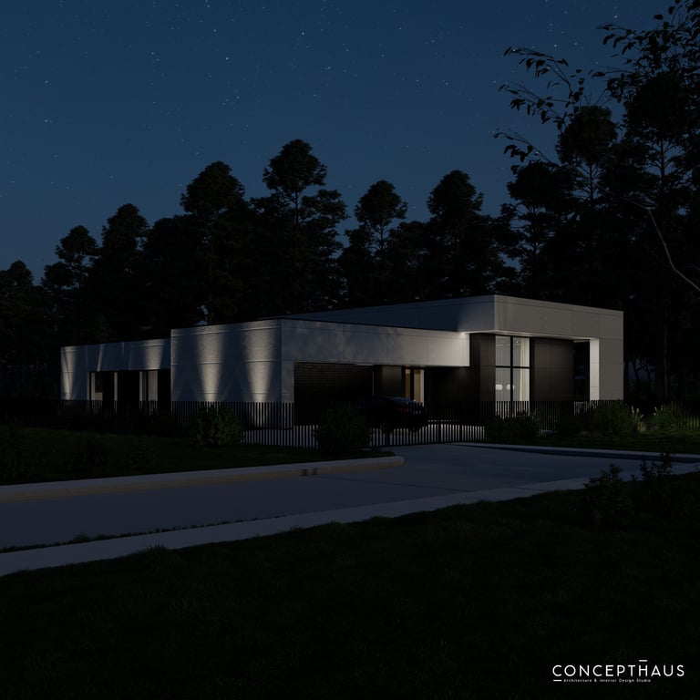 Pastatas suplanuotas iš dviejų tūrių. Aukštesniame turyje suprojektuota didelė svetainė su virtuve bei valgomuoju ir atskira sporto patalpa su pirtimi bei dušu. Žemesniame miegamųjų tūryje suprojektuotas erdvus holas, svečių san. mazgas, garažas dviems automobiliams, techninė patalpa, drabužinė prie holo ir skalbykla. Taip 2 darbo kambariai, svečių kambarys, 2 vaikų kambariai, atskira vaikų vonia ir erdvus pagrindinis miegamasis su privačia vonia bei drabužine.