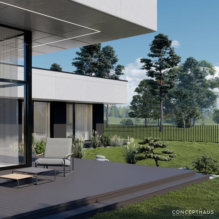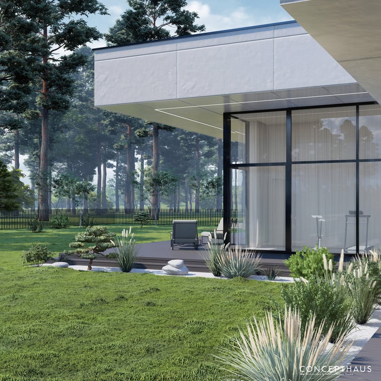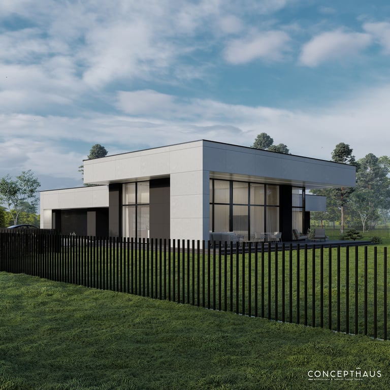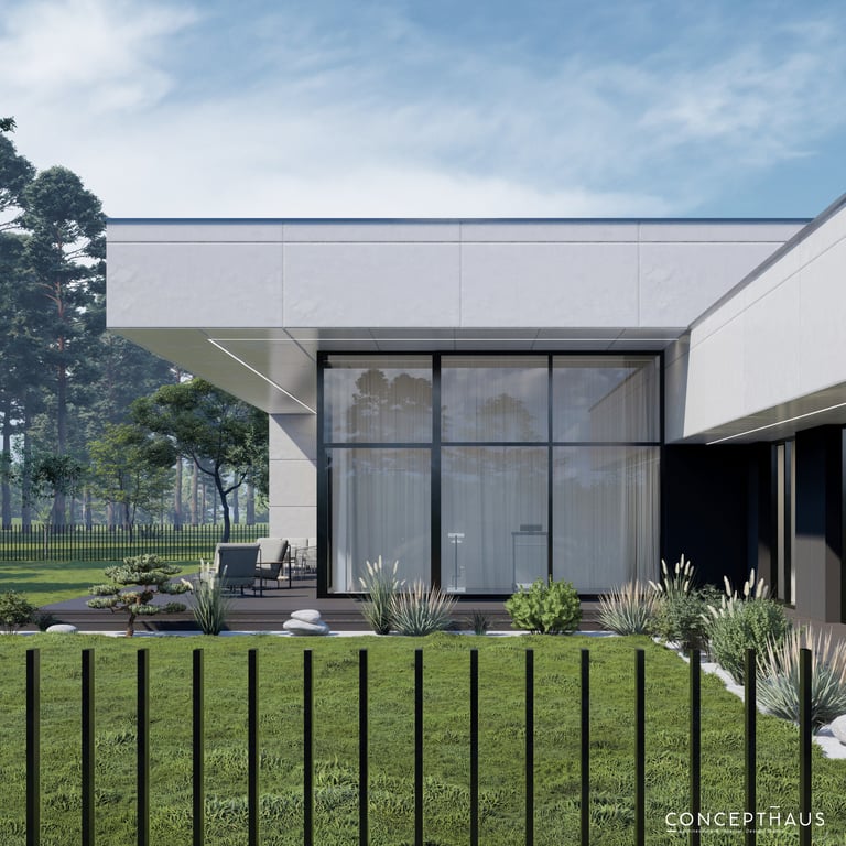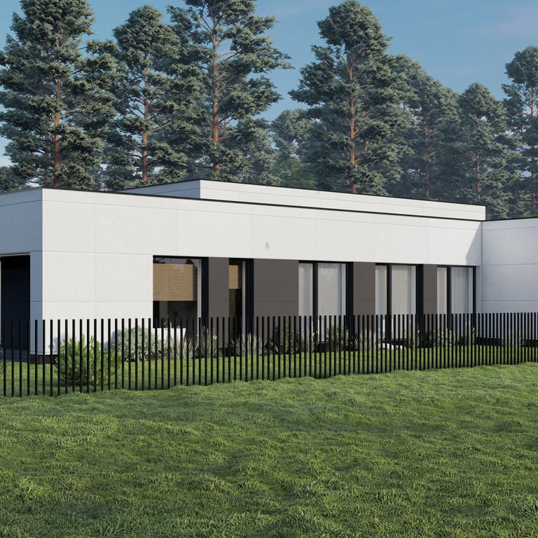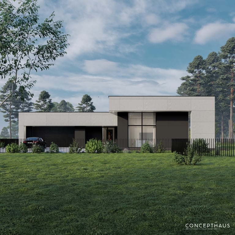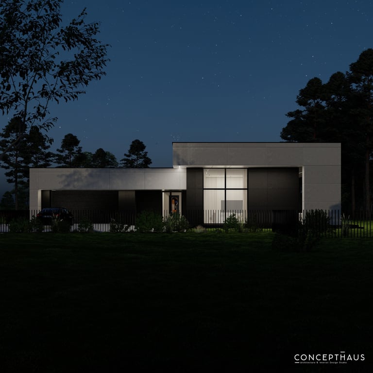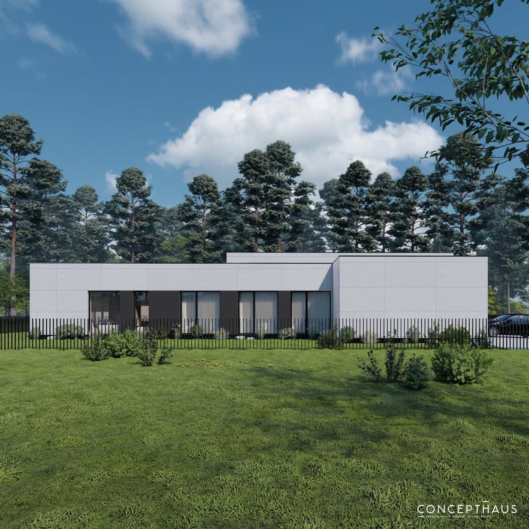 Individualus vieno aukšto gyvenamasis namas su 4 miegamaisiais, 2 darbo kambariais, garažu dviems automobiliams, atskira sporto zona bei pirtimi. Pastatas, svarbiausios namų patalpos, terasos bei kambariai orientuoti į vakarinėje pusėje esantį mišką.