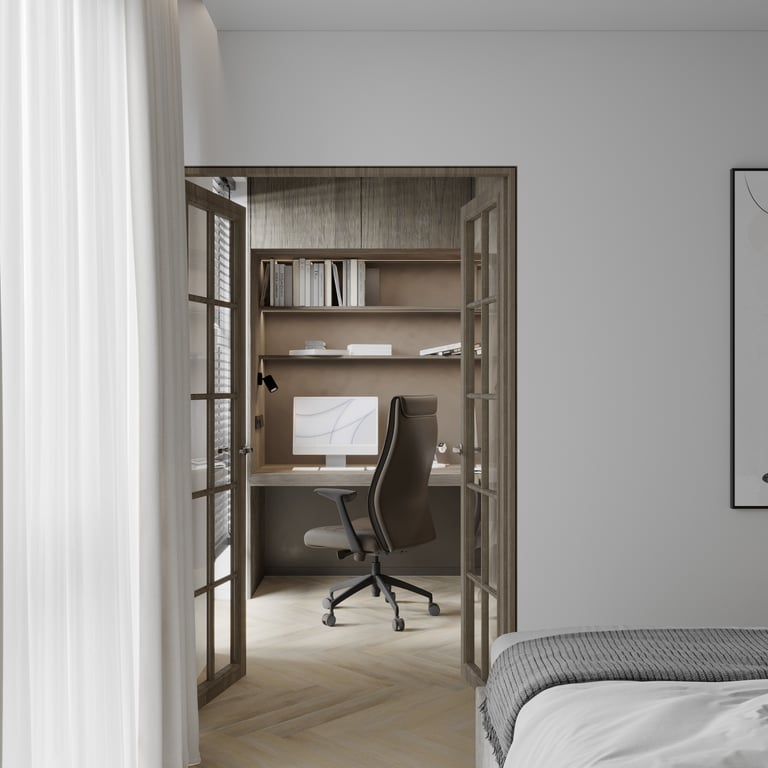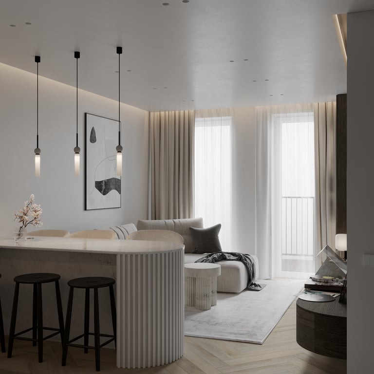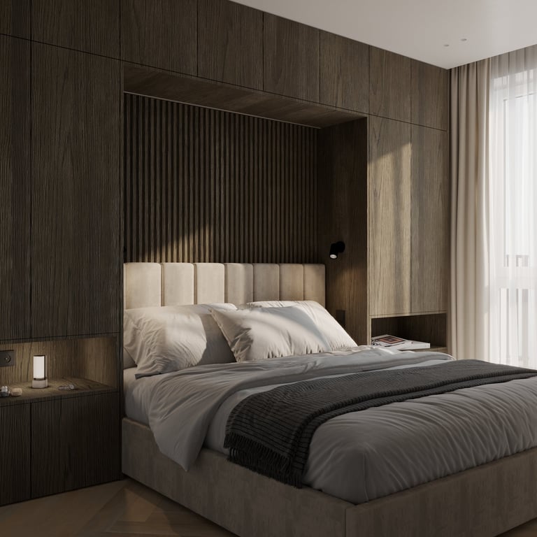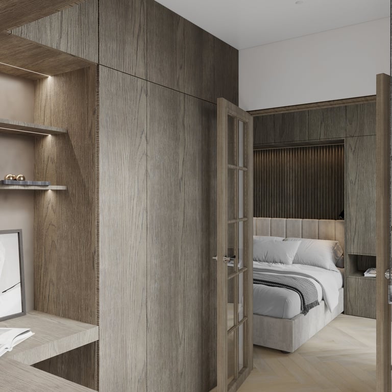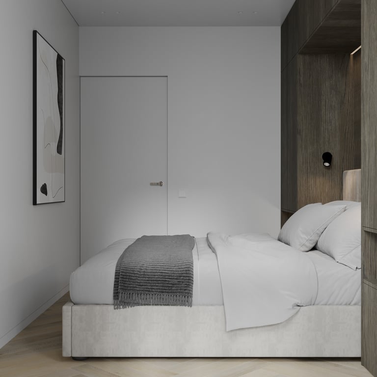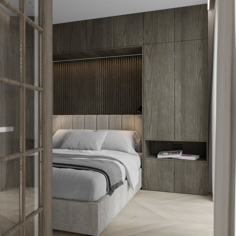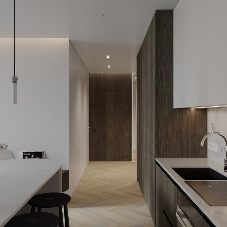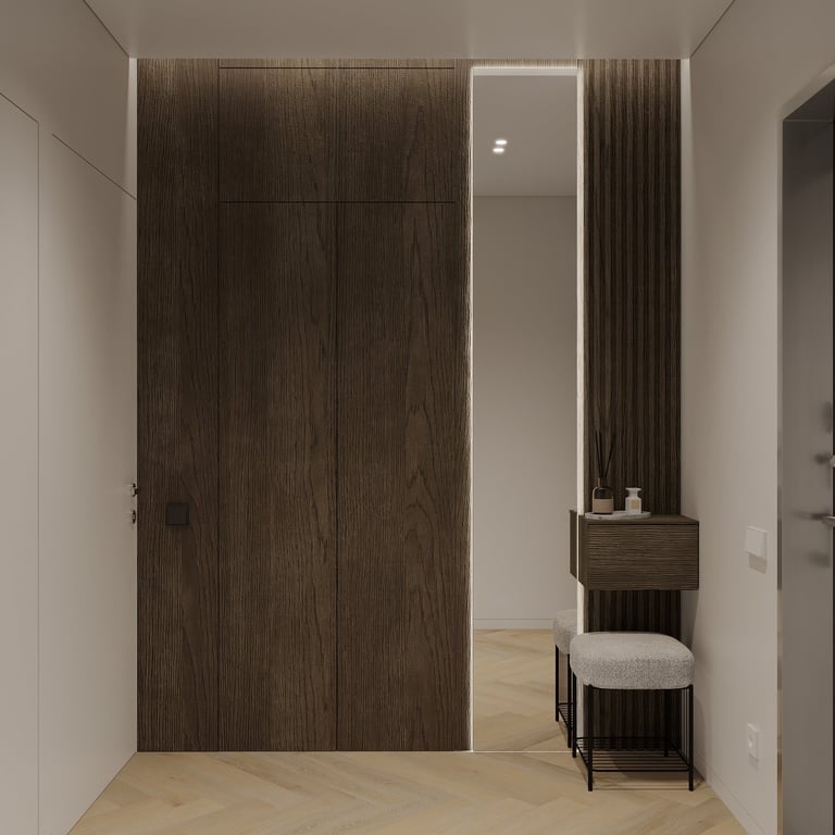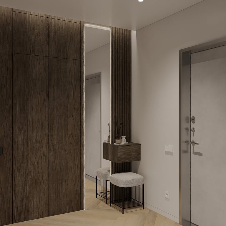 Nedidelis, bet jaukus dviejų kambarių buto interjeras, su maksimaliai išnaudotimis namų erdvėmis. Visame bute numatyta nemažai papildomų vietų daiktų laikymui. Koridoriaus zonoje suprojektuota vientisa holo ir virtuvės spinta. Miegamajame suprojektuota spinta aplink ir virš lovos, suformuojant jai jaukią nišą. Vietoje drabužinės numatyta patogi darbo vieta su papildomomis zonomis daiktų, drabužių laikymui. Virtuvėje vietoje stalo suplanuota sala su 6 pusbario kėdėmis, tam, kad būtų naudojama ne tik maisto gaminimui, bet ir jaukiems vakarams su kompanija.